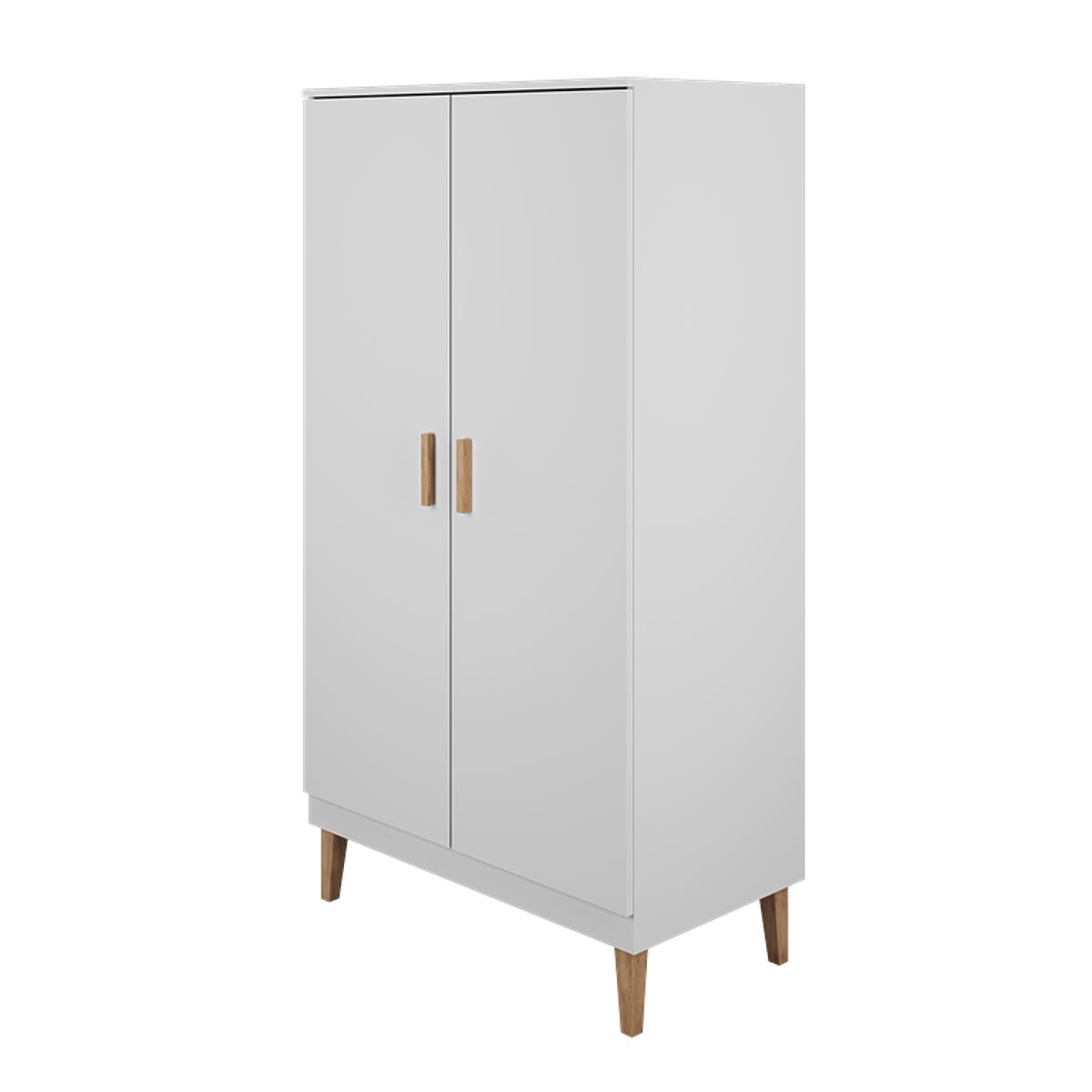 The snow-white two-door wardrobe KUBI is made from high-quality furniture board. The legs made of solid oak perfectly complement the modern Scandinavian style, which can be easily matched with any interior.