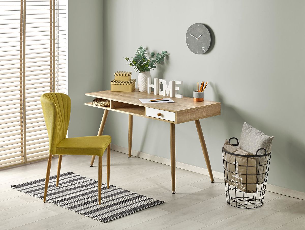 The work surface and legs of the desk are made from laminated MDF board in sonoma oak and white colors. The desk is reinforced with powder-coated steel.