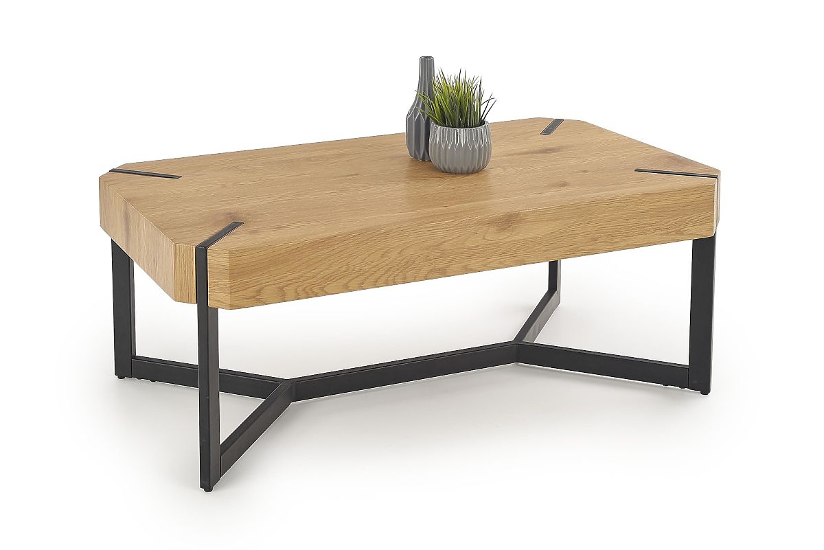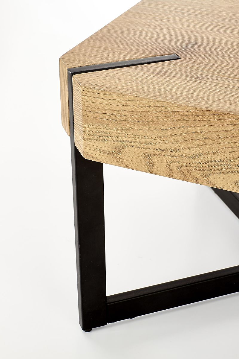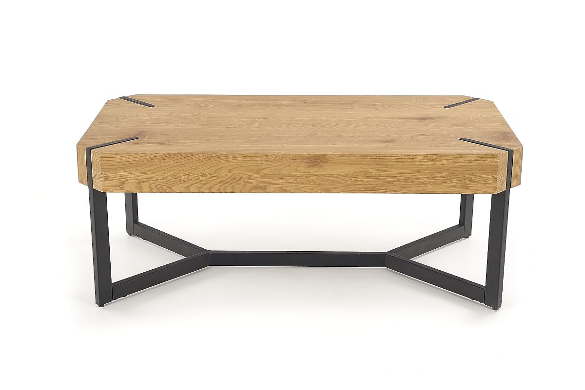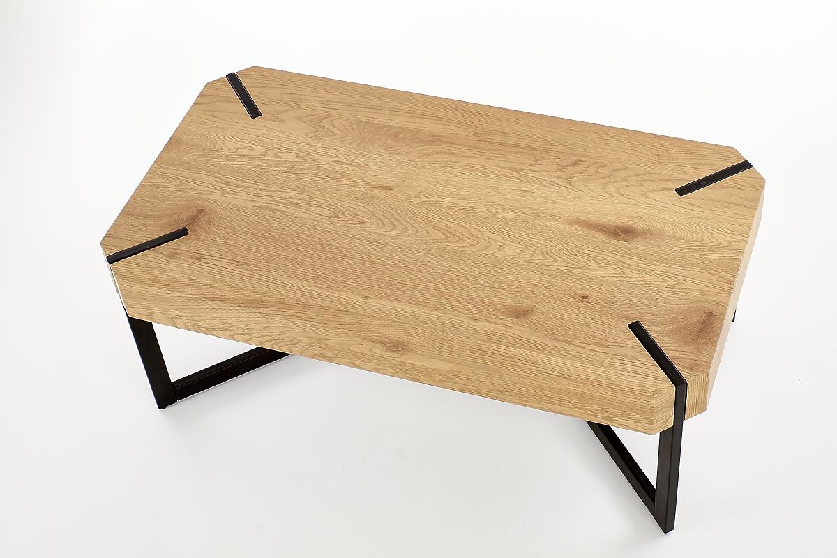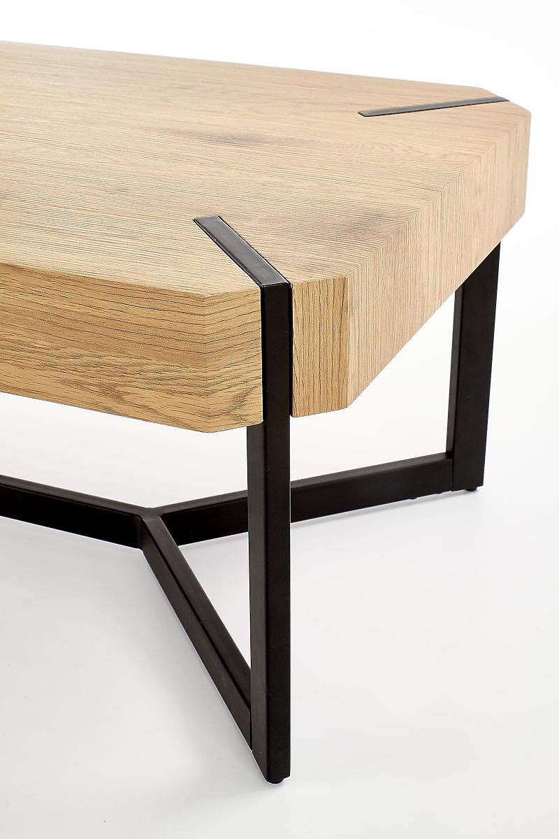 Industrial style coffee table with golden oak top and black steel frame. .. more