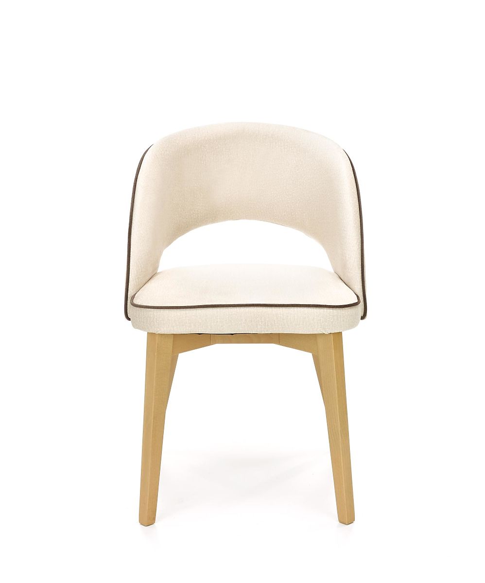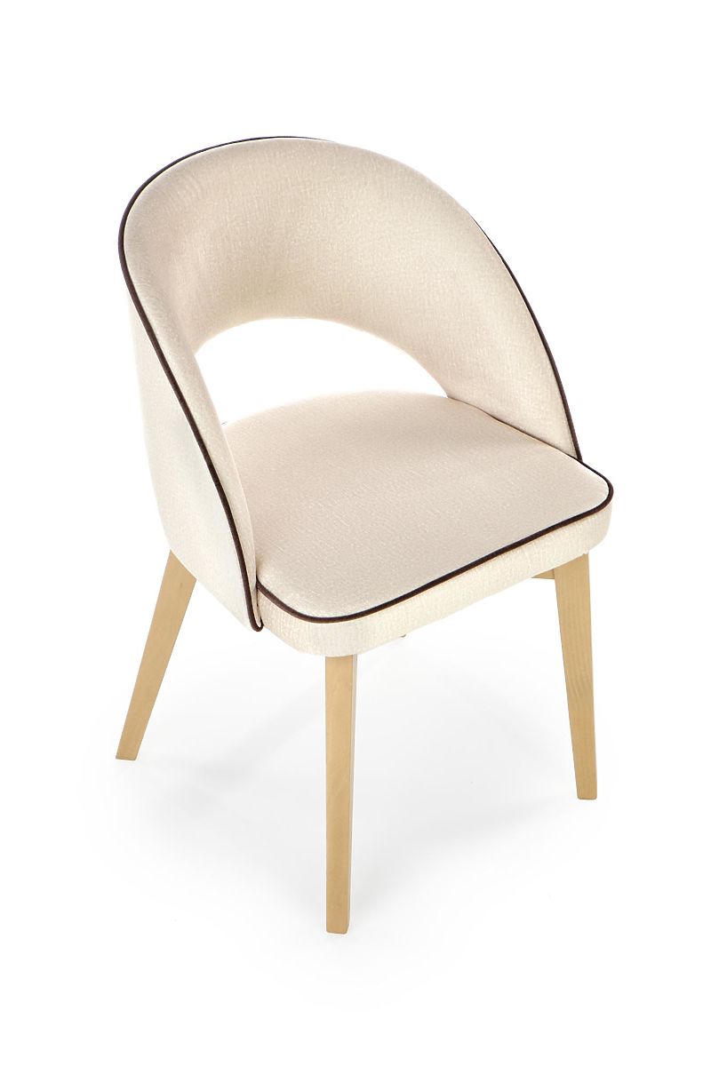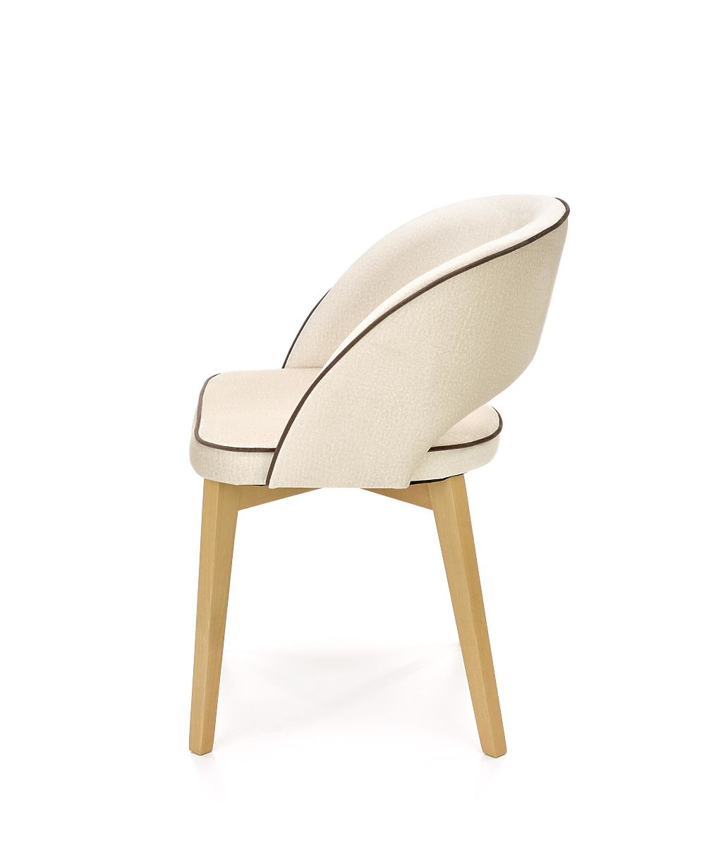 The frame is made of solid beech wood in a honey oak finish. The seat and backrest are upholstered in cream velvet fabric with black details.