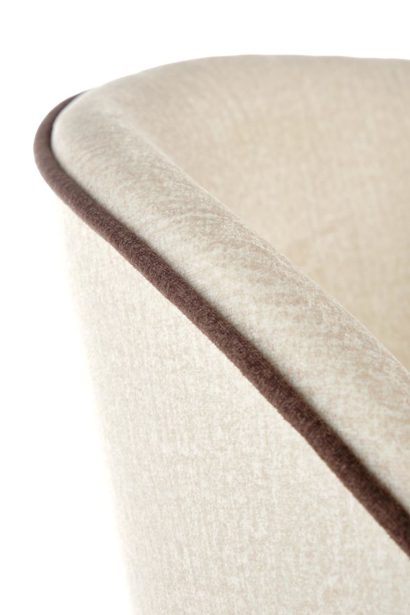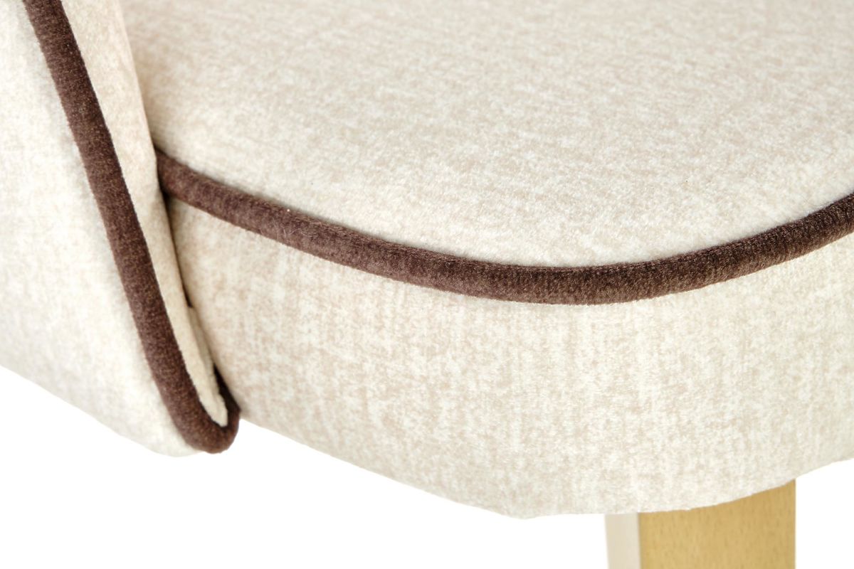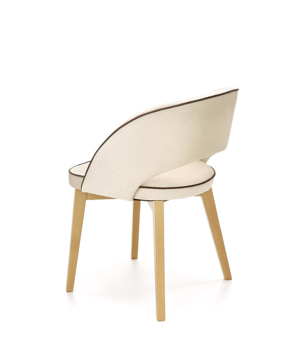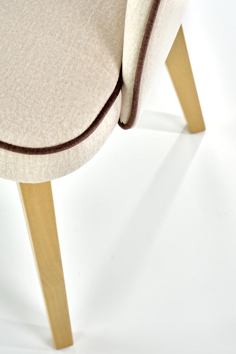 The frame is made of solid beech wood in a honey oak finish. The seat and backrest are upholstered in cream velvet fabric with black details.