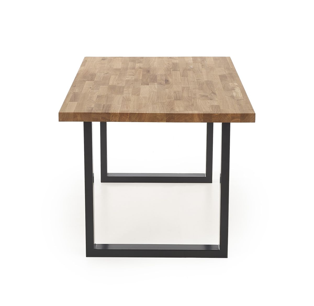 The tabletop is made of solid oak wood. The table legs are made of black powder-coated steel.