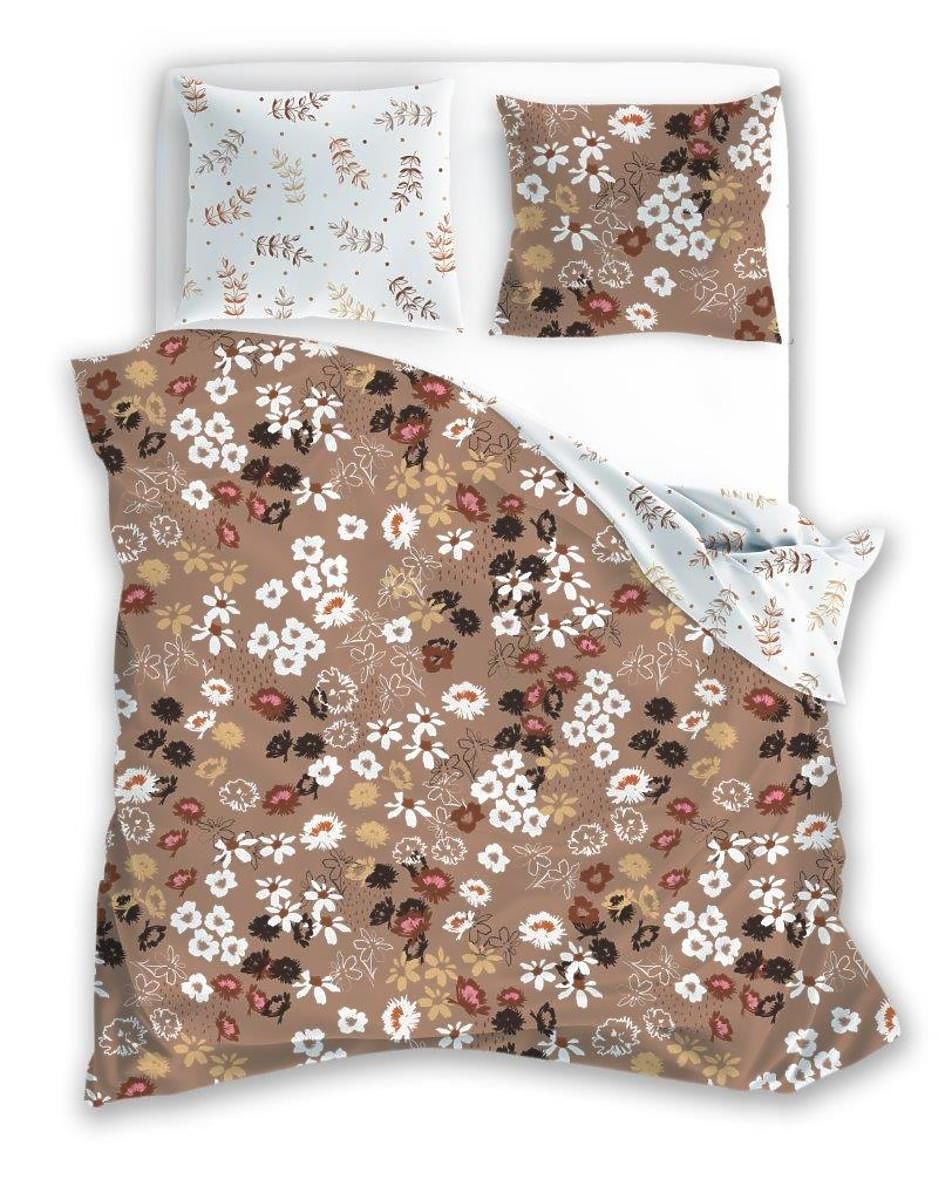 The bedding set includes a duvet cover 140 x 200 cm and a pillowcase 70 x 90 cm . The covers are double-sided , where the front side is decorated with multi-colored flowers on a brown background, and on the other side, leaves and small dots are depicted on white.