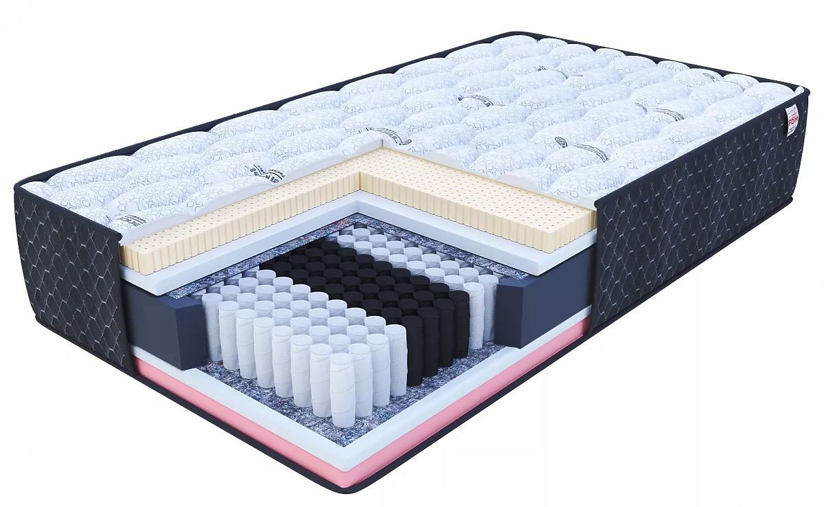 On one side of the mattress, there is a layer of latex, which is very flexible, improving comfort, and thanks to its perforated structure, it is highly breathable. Another layer is made of pur foam T25, which is characterized by high resistance to deformation, flexibility, breathability, and stabilizes the body during rest. Between the springs and the pur foam T25, a separating material has been inserted. This is natural felt, which can significantly extend the lifespan of the mattress and strengthen its structure. Sleep comfort is incredibly enhanced by the thermoplastic foam VISCO, which is found on the other side of the mattress. Under the influence of body temperature and weight, it perfectly follows the natural curves of the body, ensuring proper support for the entire body. VISCO and the springs are again separated by a layer of durable pur foam T25 and natural separating material.