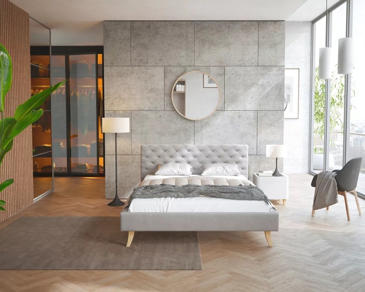 The upholstery material of the bed is gray velour fabric Trinity. It features a fine structure and high resistance to sunlight. It is soft, fluffy, and pleasant to the touch. It is also very resistant to abrasion and pilling. You will be impressed by its modern look and the decorative stitching on the headboard.