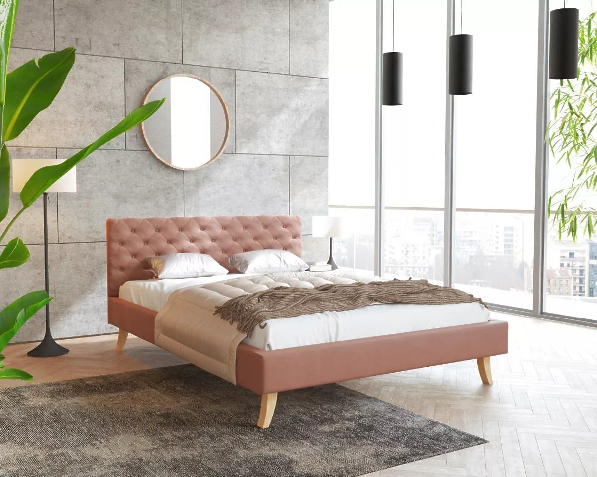 The upholstery material of the bed is old pink velour fabric Trinity. It is characterized by a fine texture and high resistance to sunlight. It is soft, fluffy, and pleasant to the touch. It is also very resistant to abrasion and pilling. You will be impressed by its modern look and decorative stitching on the headboard.