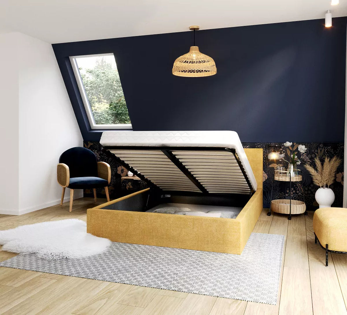 The use of high-quality furniture board in the construction of the bed increases its strength and durability. This means that the bed can withstand stress and pressure, which is key to safety and comfort while sleeping. The combination of a lifting grid and lifting pistons to create useful storage space under the bed is a great solution for bedrooms with limited storage space. This practical feature allows you to use the available space in your bedroom more efficiently and organized.