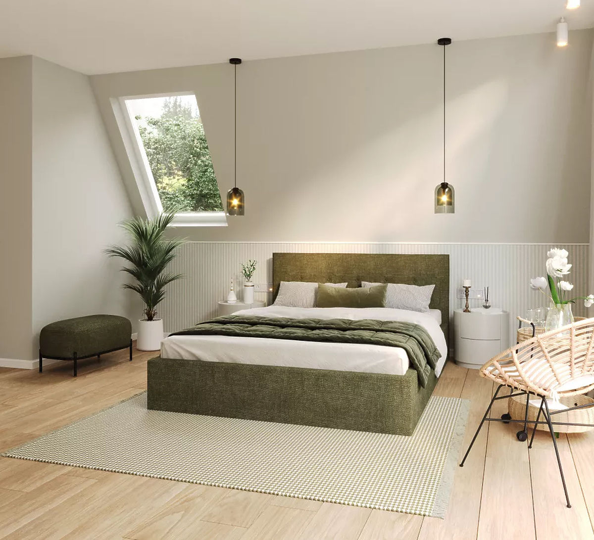 The TULSA olive green upholstered bed measuring 160 x 200 cm is an excellent choice for the bedroom. This bed offers a combination of elegance and comfort, making it ideal for your room. The dimensions of 160 x 200 cm are wide and long enough to provide a comfortable sleep for two people. The olive green color adds freshness and calmness to the room, thus creating a pleasant atmosphere in your bedroom.