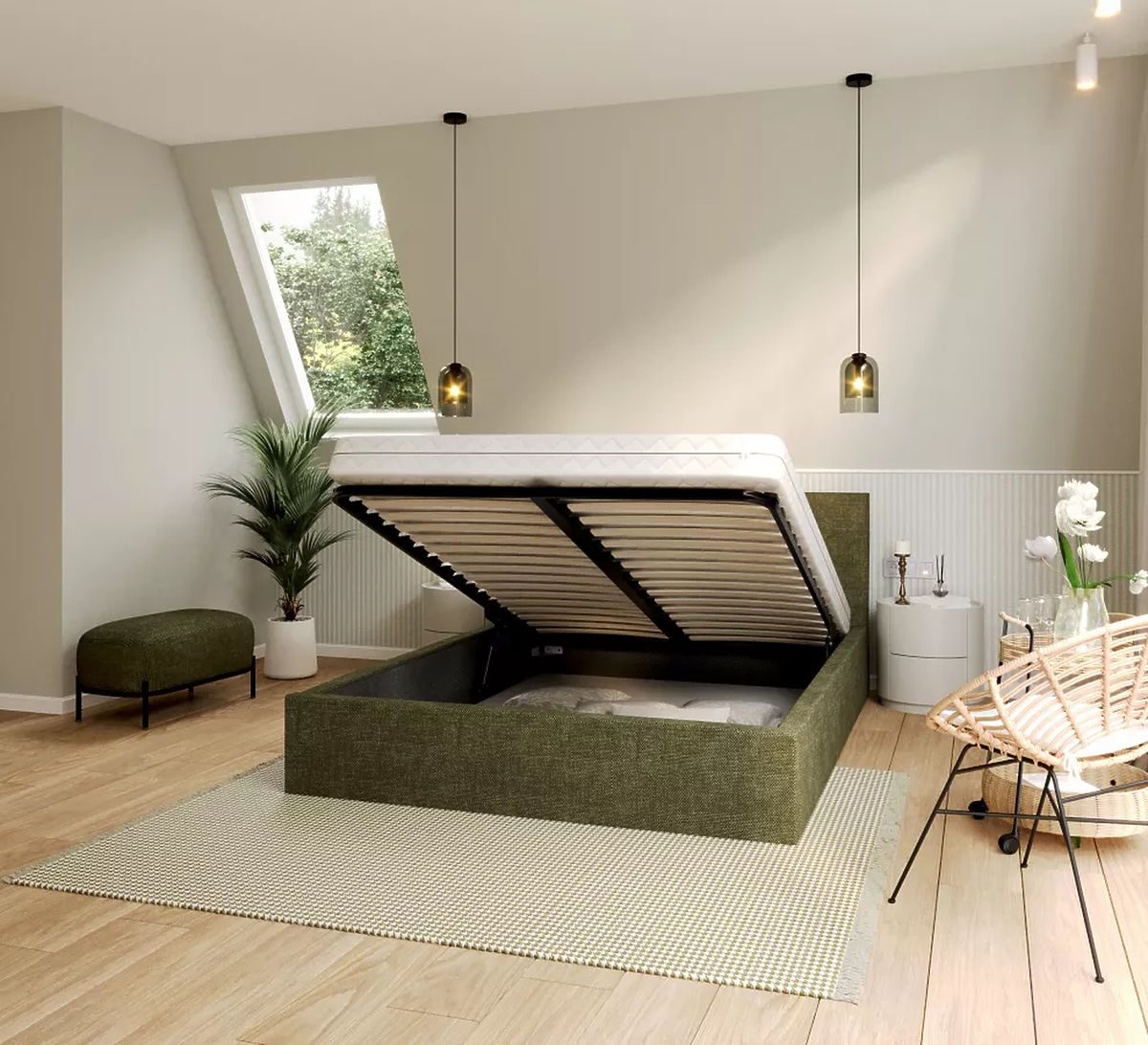 The use of high-quality furniture board in the construction of the bed increases its strength and durability. This means that the bed can withstand stress and pressure, which is key to safety and comfort while sleeping. The combination of a lifting grid and lifting pistons to create useful storage space under the bed is a great solution for bedrooms with limited storage space.