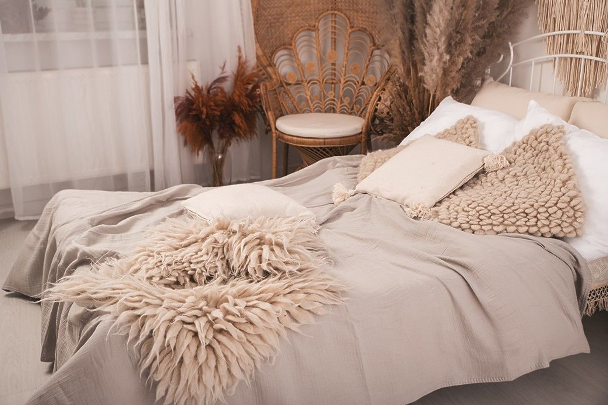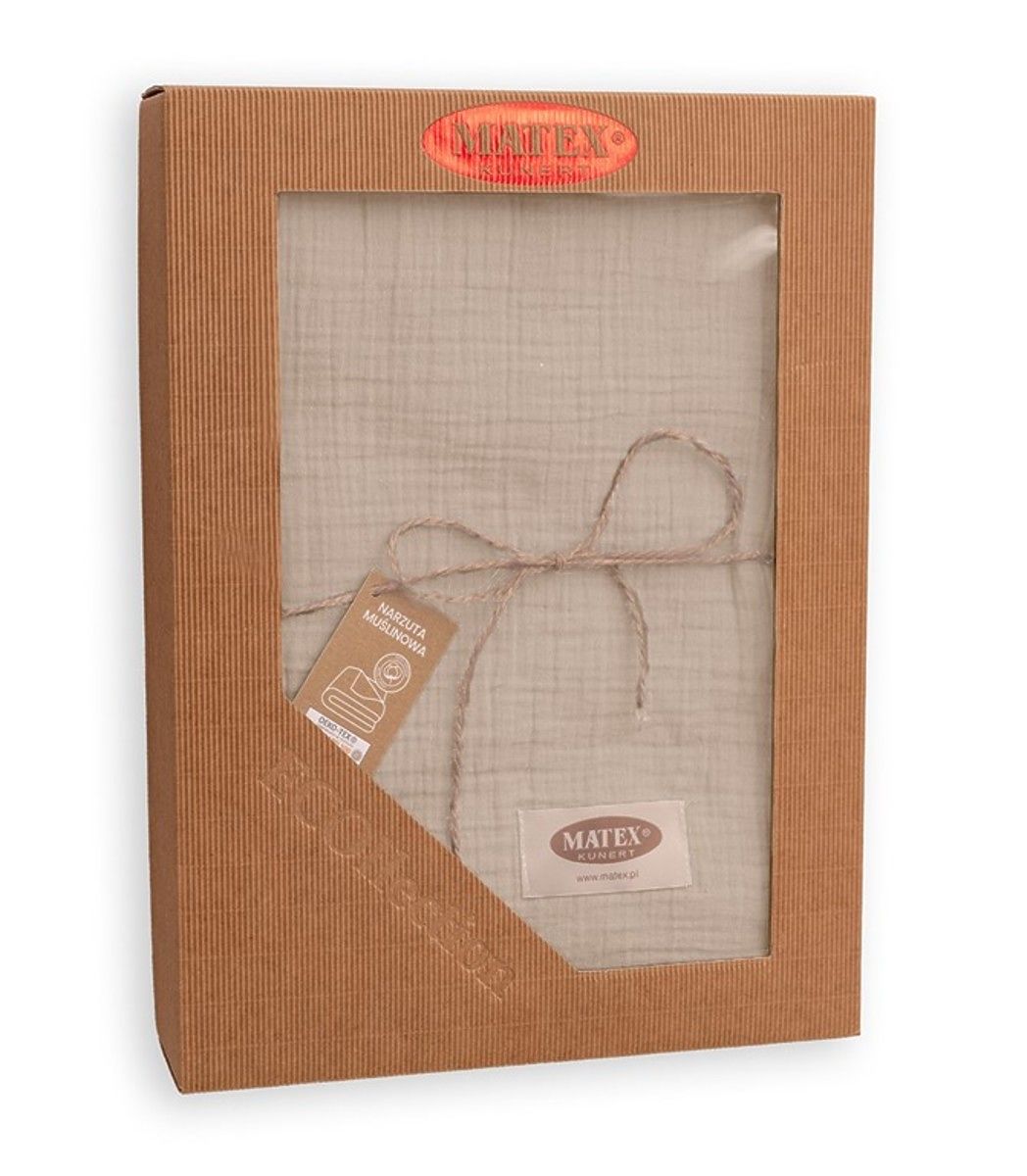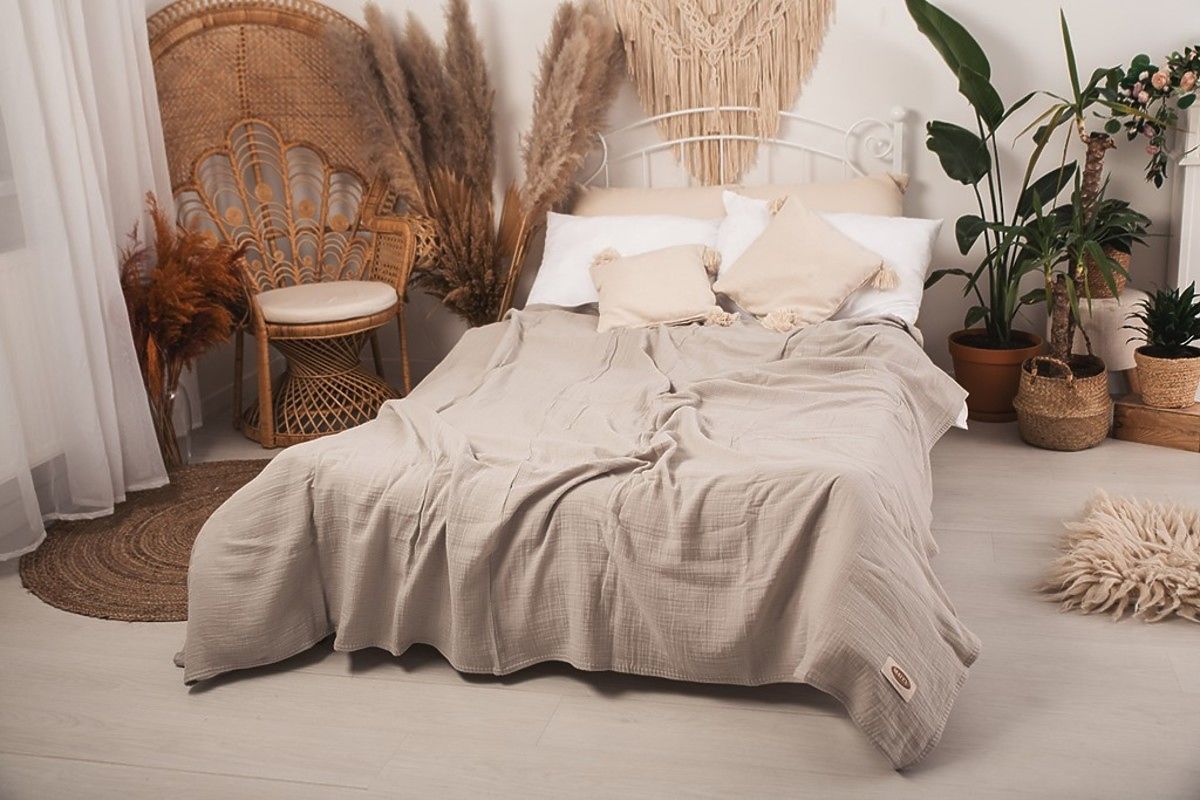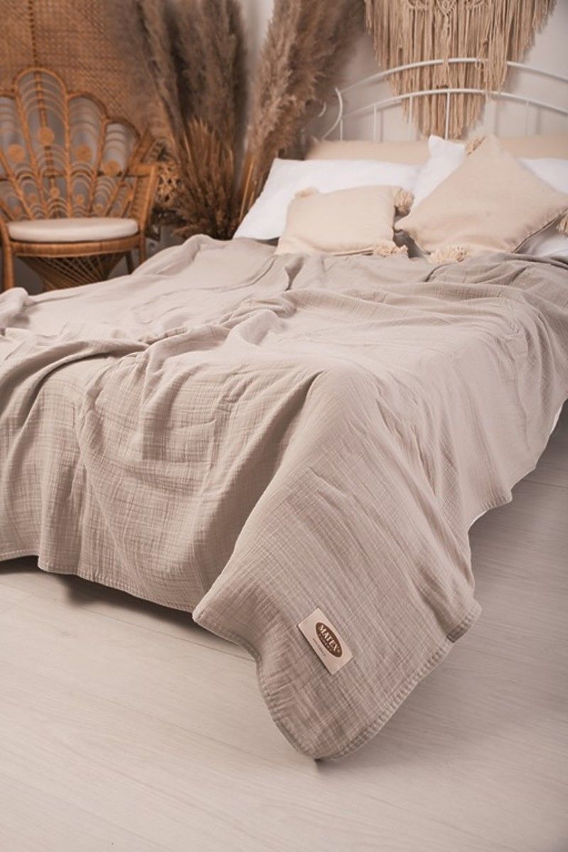 Muslin bedspread 240x210 cm. It is light, pleasant and soft to the touch. It has excellent breathability and the ability to regulate temperature. It does not require ironing, always has an aesthetic effect and gives the bedroom a cozy look.