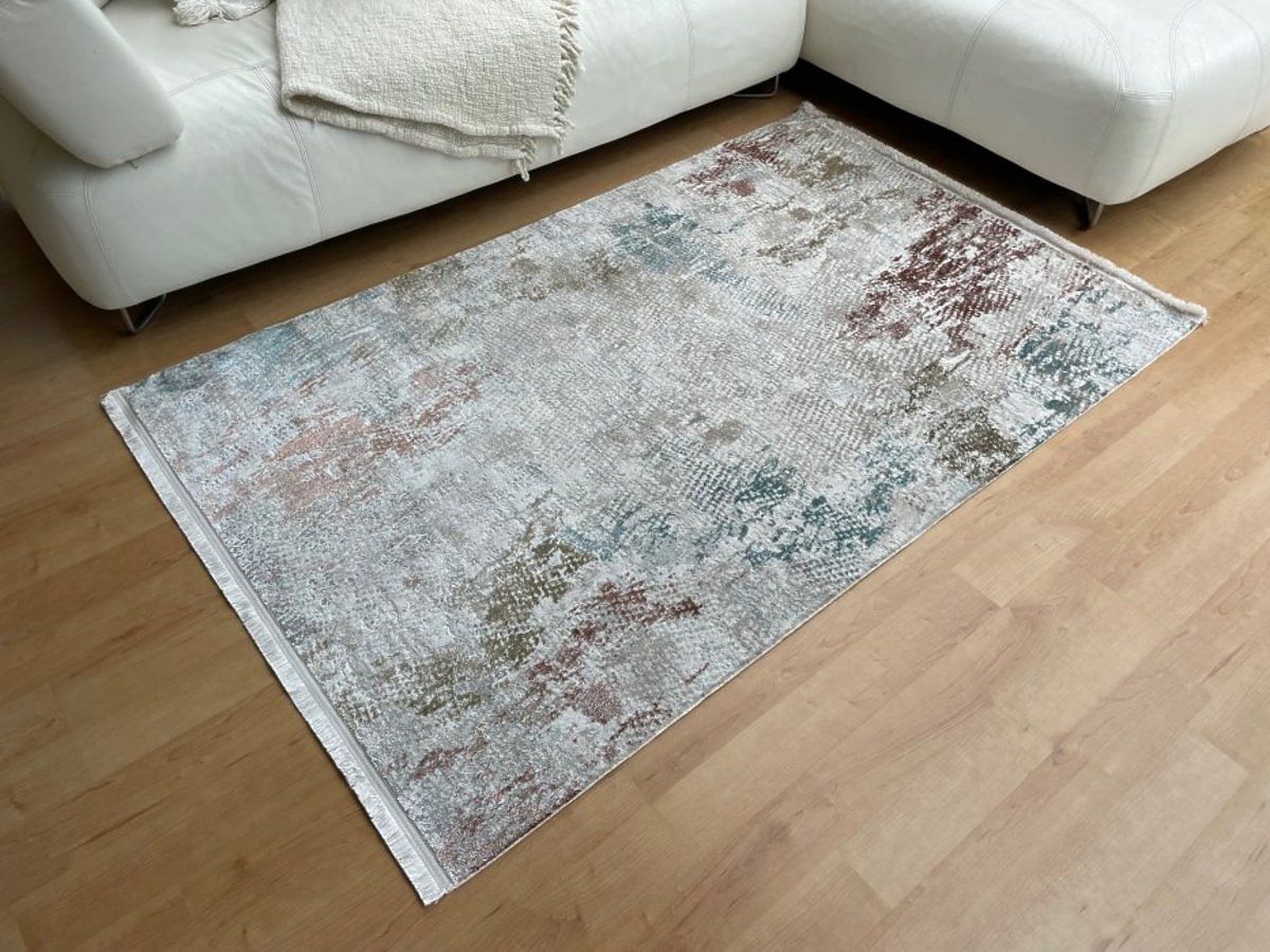 The light beige background of the carpet, complemented by scattered tones of brick and azure, creates a harmonious whole that will add a touch of elegance to your interior.