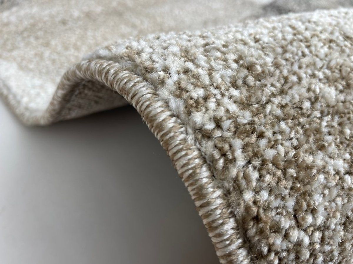 Aspect rug in beige shade are made of 100% frisé type polypropylene fiber, which guarantees a pleasant surface . Its dense hair is 12 mm high. It is equipped with antistatic treatment and chemlon stitching in the same color as the carpet.