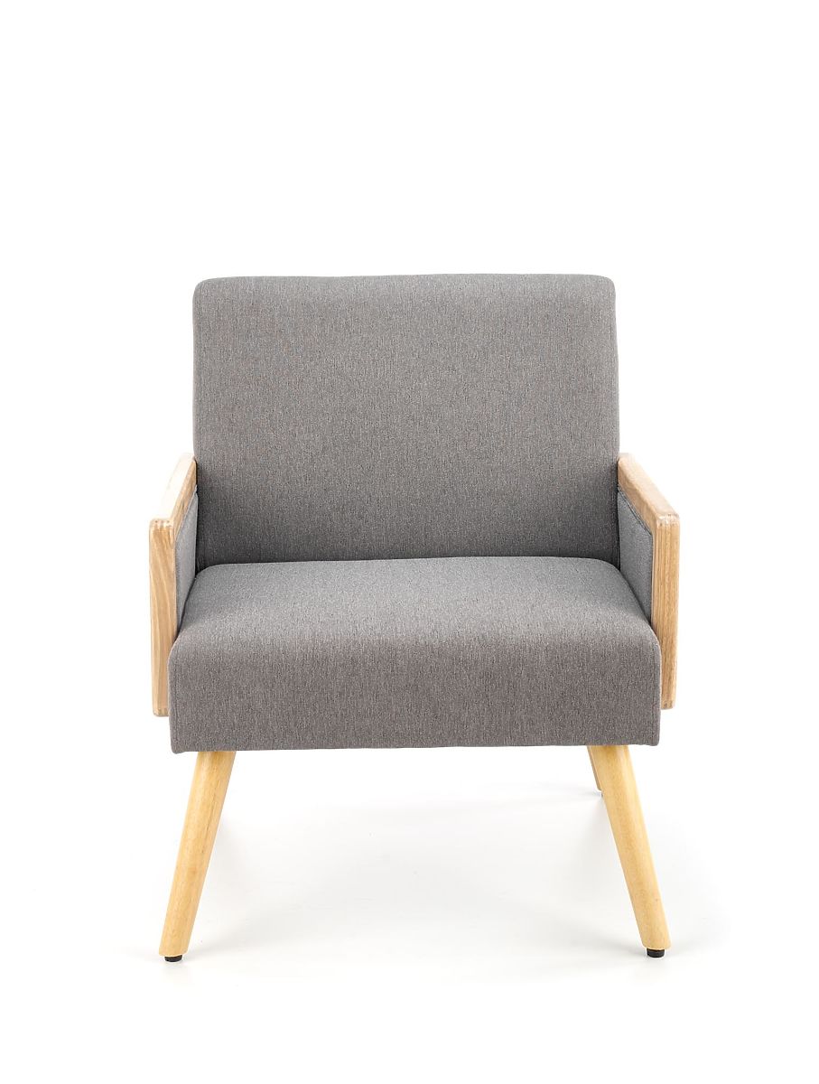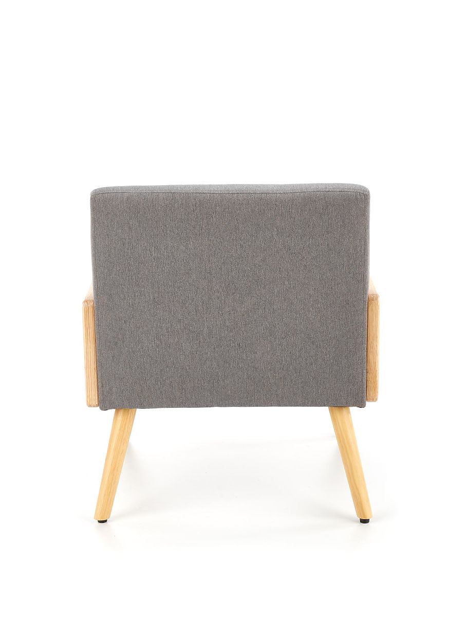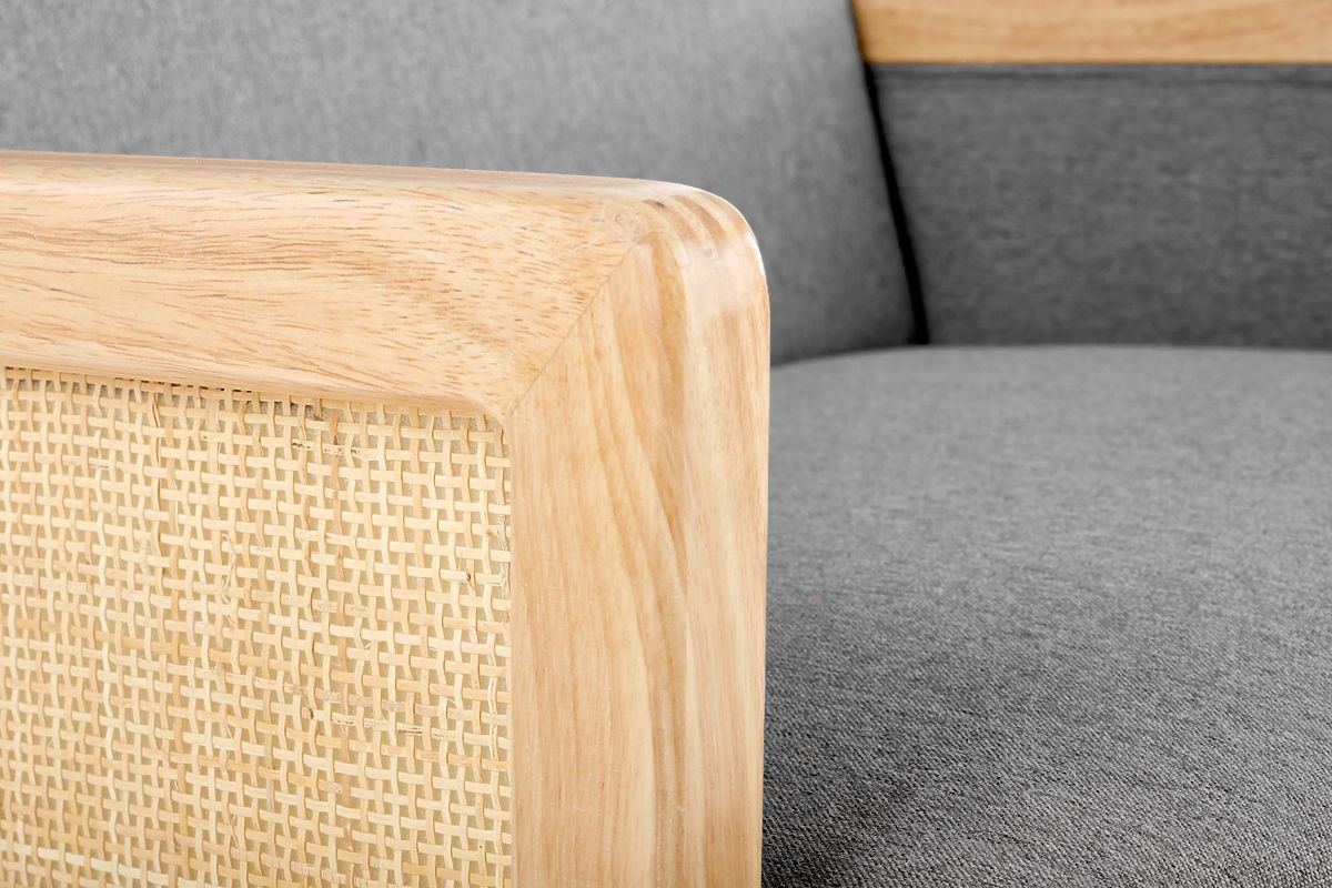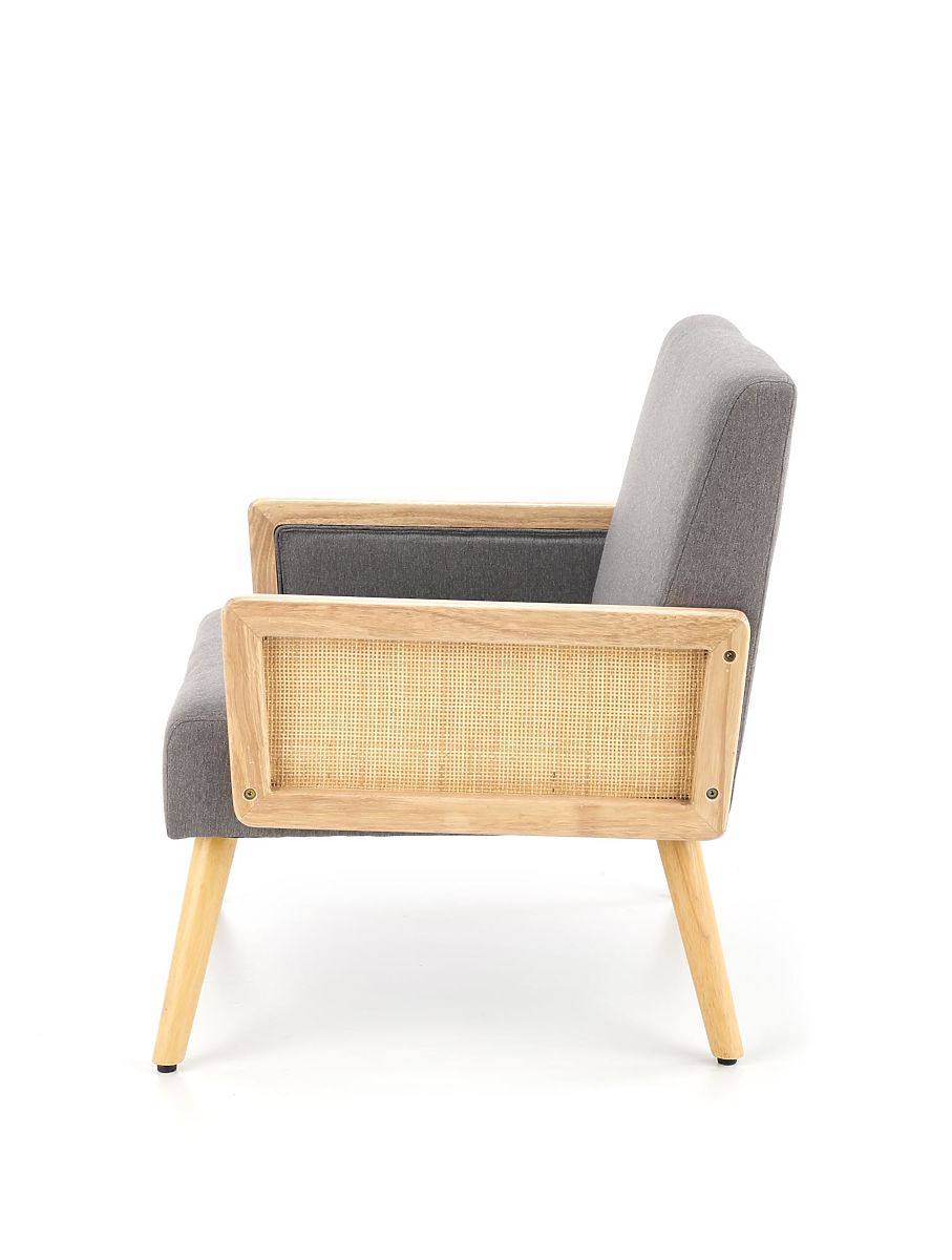 Grey armchair made of fabric and synthetic rattan. .. more