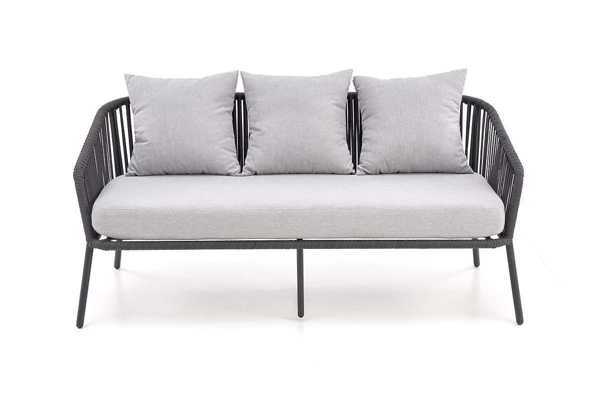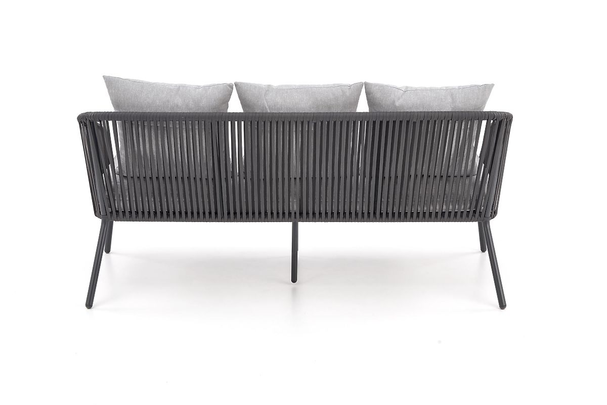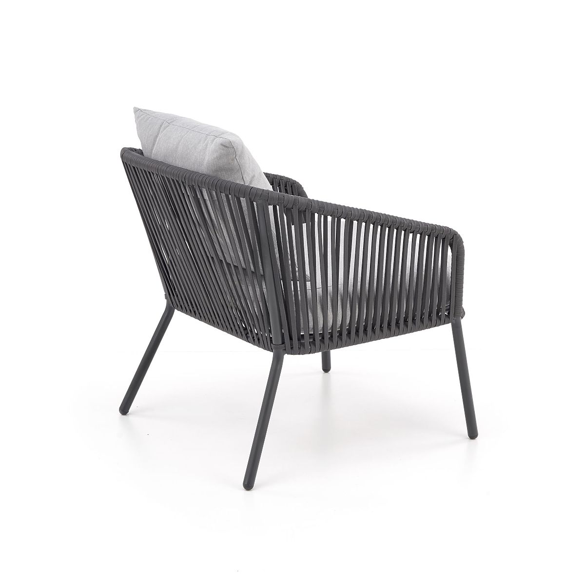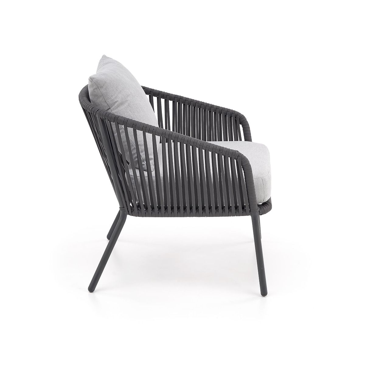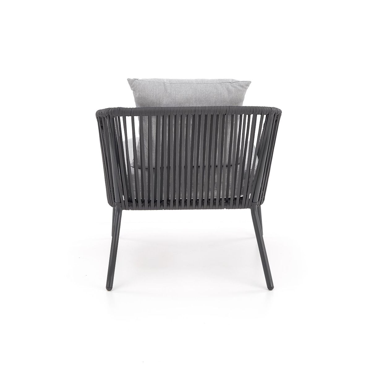 This patio furniture is made of powder-coated aluminum combined with ropes in a dark ash color, which adds a twist to the overall design as well as robustness. Aluminum is characterized by high resistance to weather effects and ensures a long service life of the furniture.