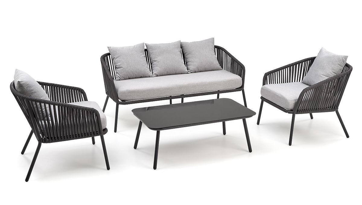 The set includes a two-seater sofa, two armchairs, a table and cushions.