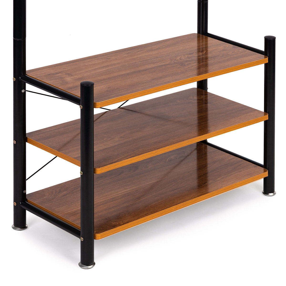 The stand at the bottom has three functional shelves where you can place smaller clothing items, handbags, and even shoes.
