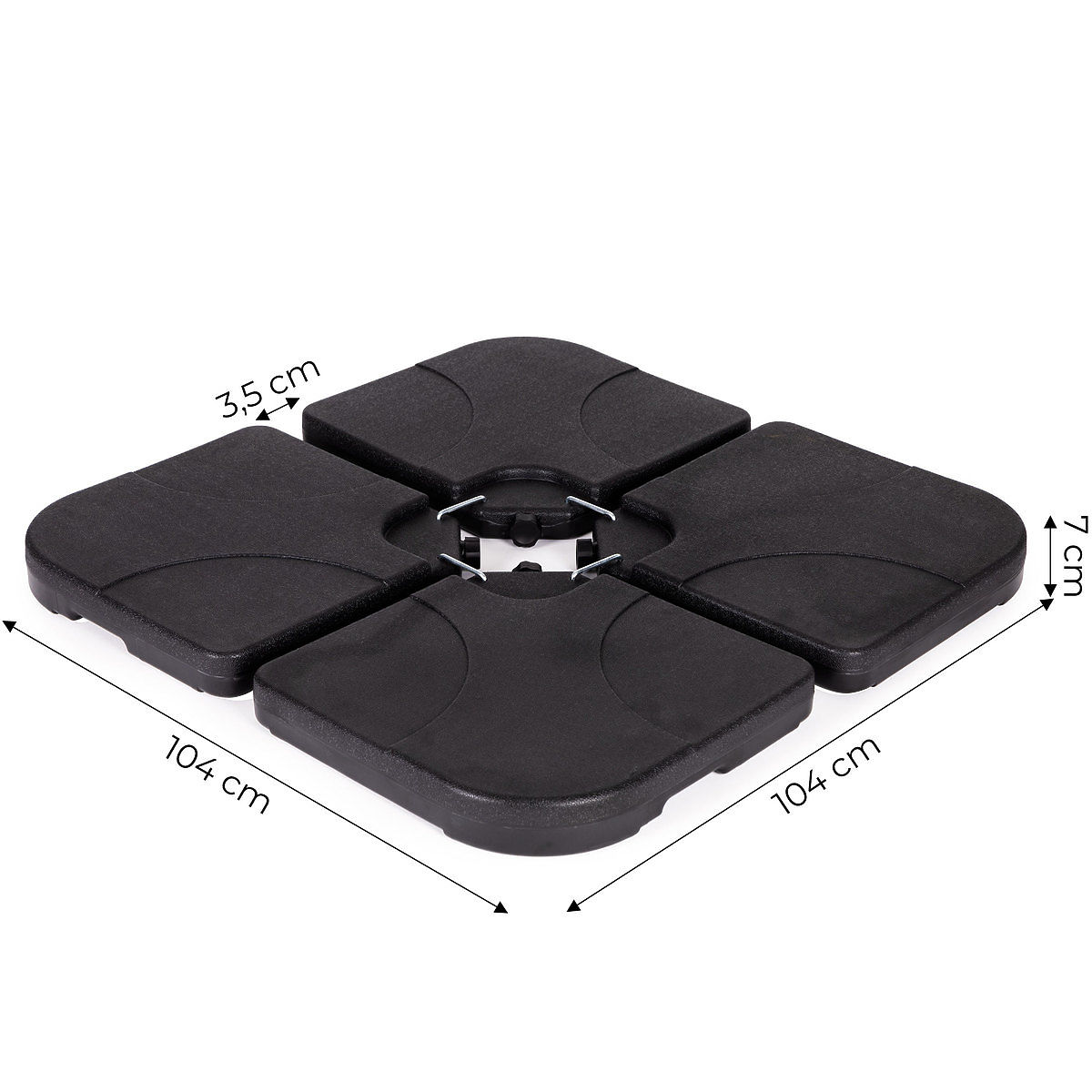 STURDY AND PRACTICALEach of the 4 elements of the base has a removable cap, which, when unscrewed, allows the base to be filled with water. A water-filled panel holds up to 15 l, and the total weight of the filled base reaches approximately 60 kg, which will support even a large parasol.