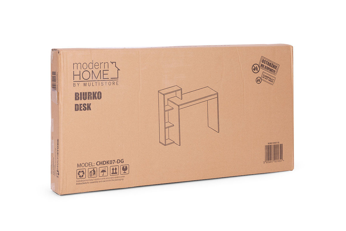 Modern desk and simple design, this is an offer for lovers of unusual style and functionality. The desktop and shelves are made of chipboard, covered with laminate in grey color. Thanks to this, the furniture gently shines and looks very luxurious.