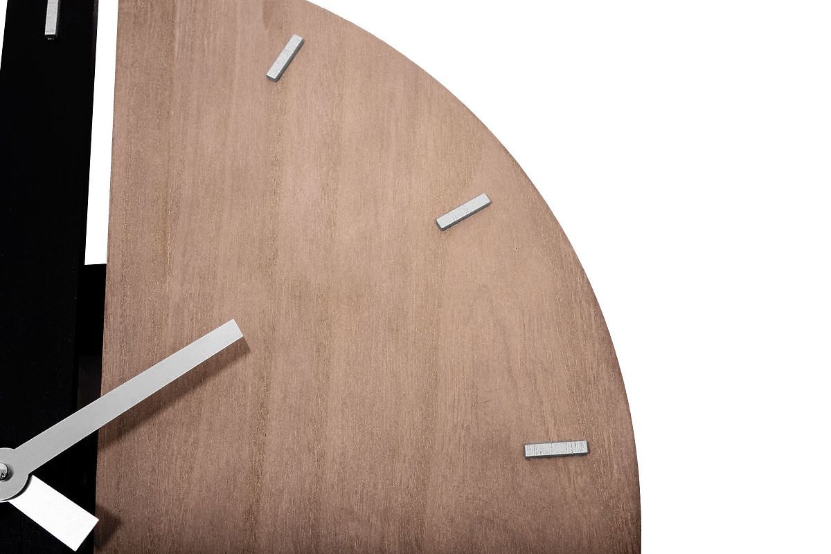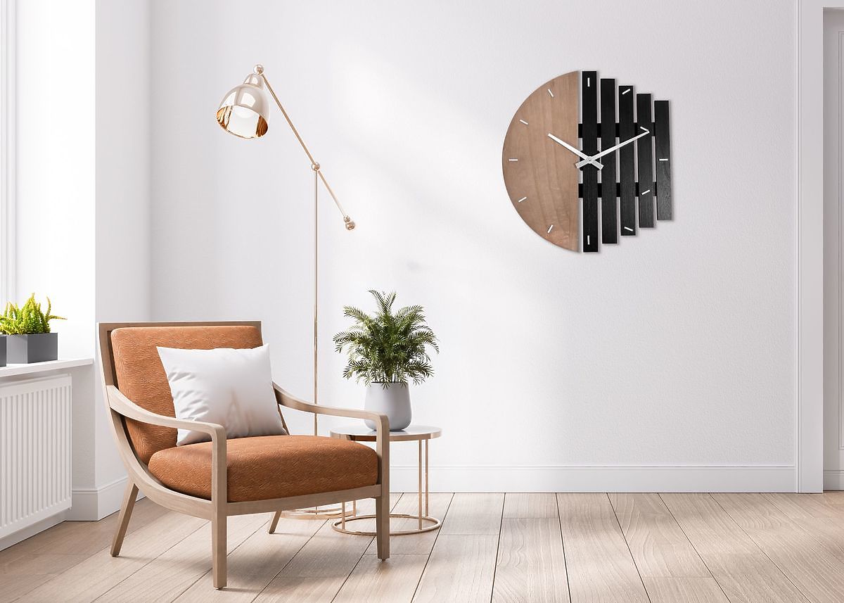 Stylish wall clock with an unconventional design is a perfect accessory that immediately catches the eye and adds a unique character to your interior. The clock combines natural wooden material with a sophisticated black color look. With its unusual shape, it will become the centerpiece of any room where you place it.