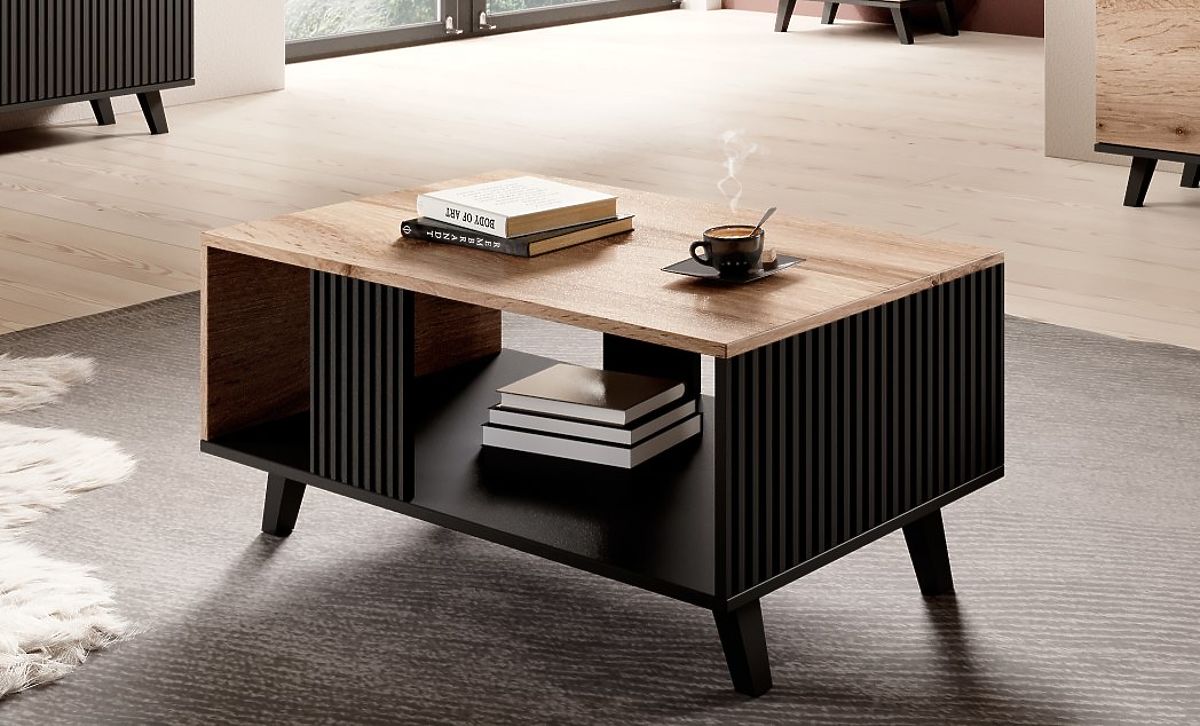 A modern coffee table combining Wotan oak and black for a sophisticated look. .. more