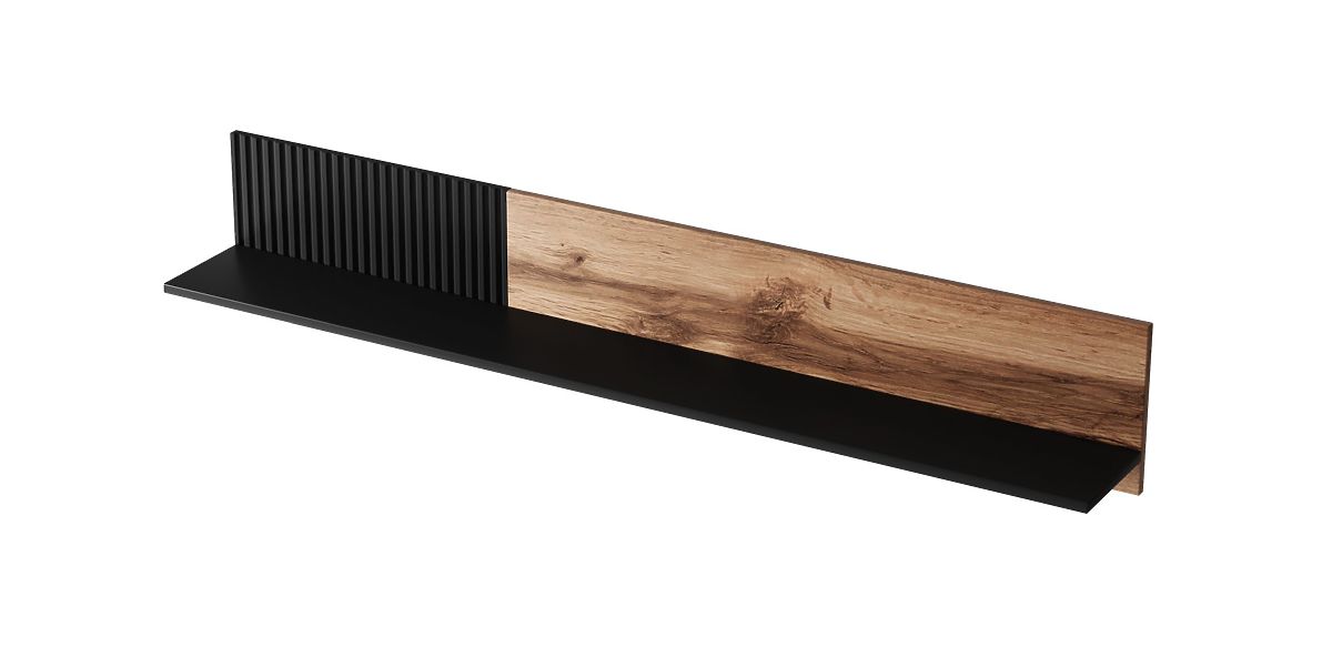 A modern wall shelf in Wotan oak and black, perfect for displaying decorations or books. .. more
