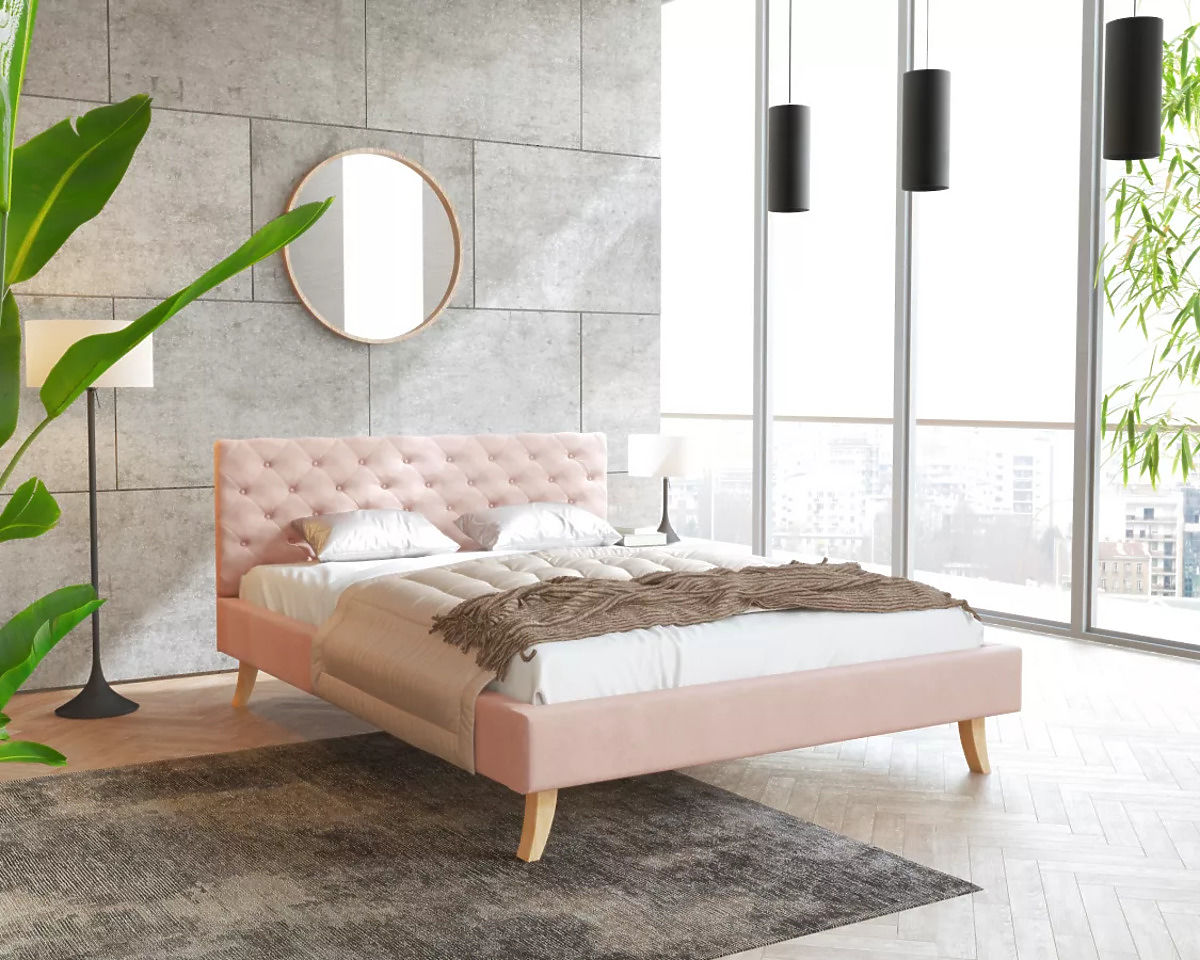 The upholstery material of the bed is powder pink velour fabric Trinity. It features a fine texture and high resistance even to sunlight. It is soft, fluffy, and pleasant to the touch. It is also very resistant to abrasion and pilling. You will be impressed by its modern look and decorative stitching on the headboard.