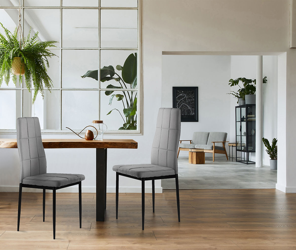 The chairs will perfectly match the family table in your dining room and kitchen. The grey quilted furniture made of pleasant-to-touch fabric fits into any interior and adds the right charm.