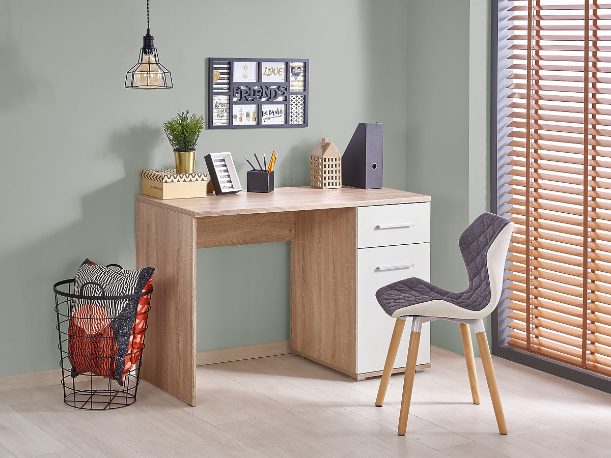 A stylish writing desk in Sonoma oak/white color, combining modern appearance and practical features. Made from laminated furniture board with ABS edges, it is ideal for efficient work and organization.