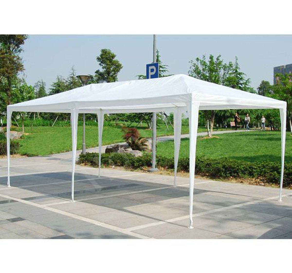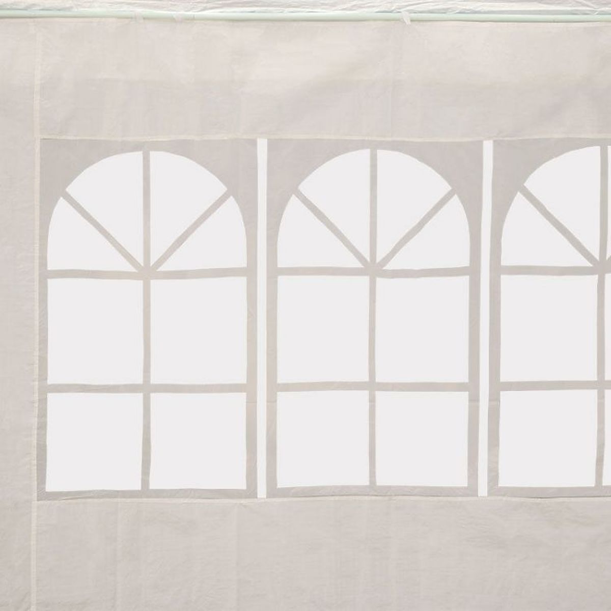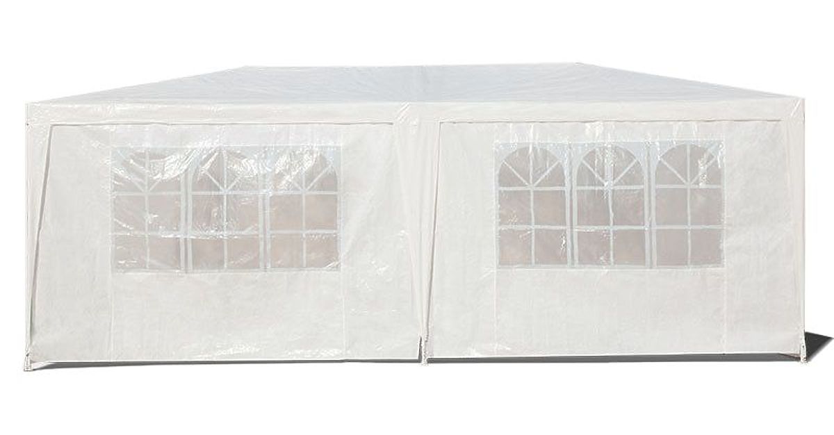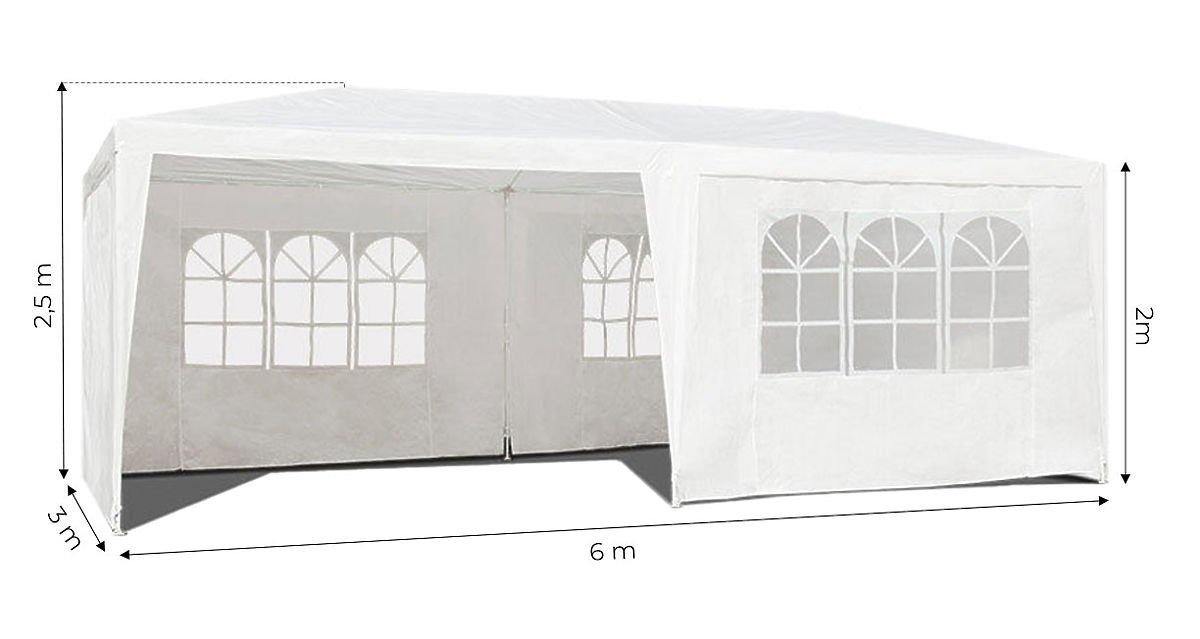 DURABLE CONSTRUCTIONThe tent frame is made of strong, powder-coated metal tubes, with a diameter of 32/25/25 mm, ensuring stability and corrosion resistance. The sturdy construction guarantees durability even with intensive use. Each tent leg is secured to the ground with pegs, enhancing its stability. The roof and walls are made of durable and weather-resistant polyethylene with a weight of 100 g/m2 in an elegant white color.