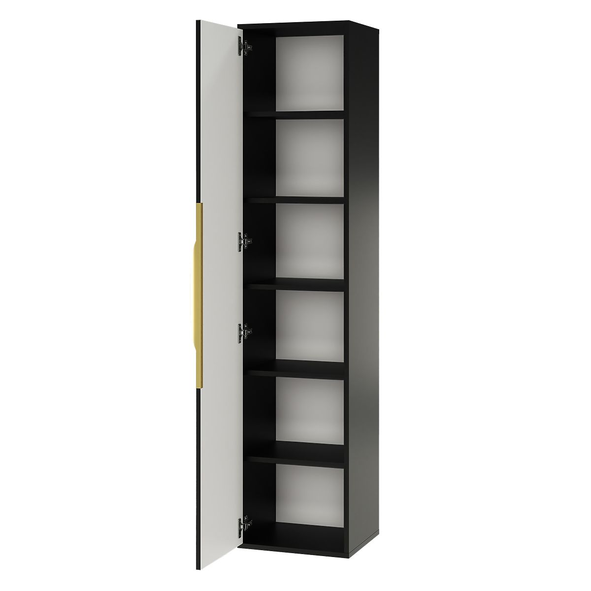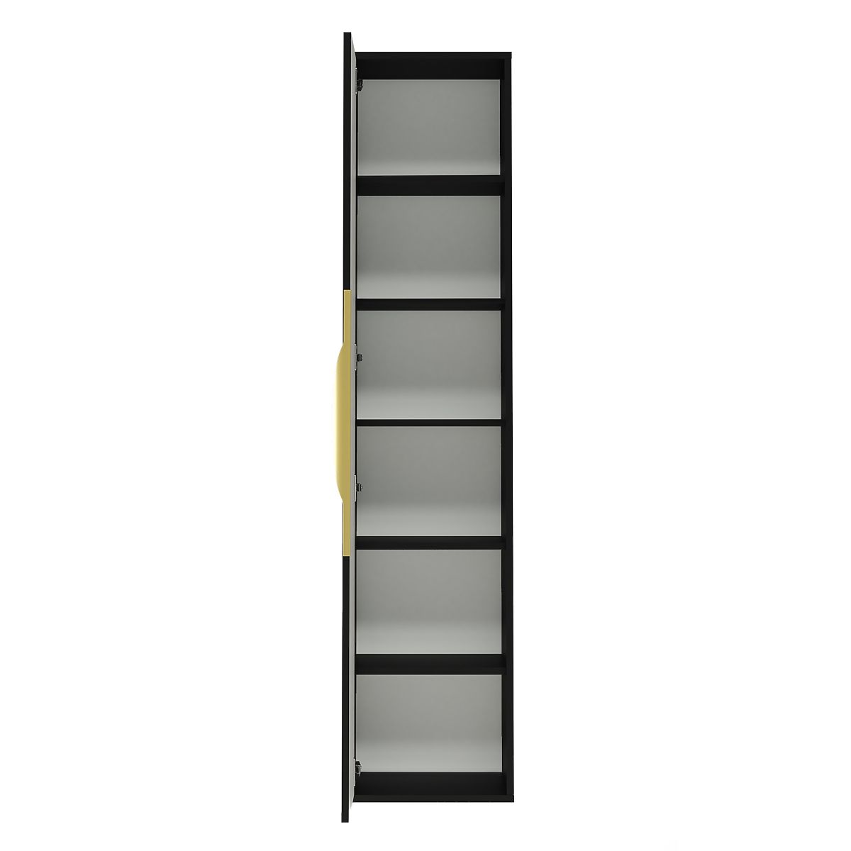 Black Avila bathroom column with gold handle and five shelves. .. more