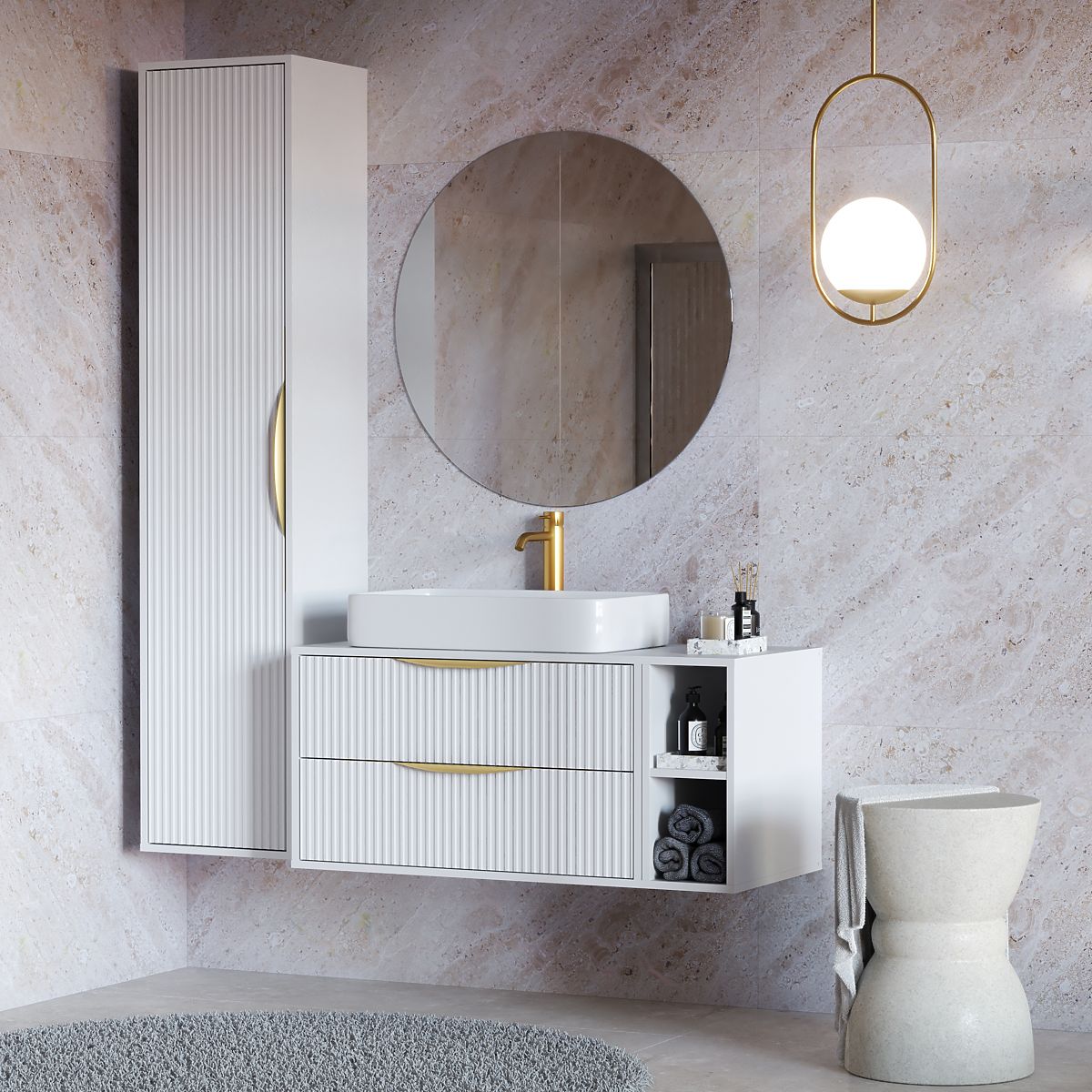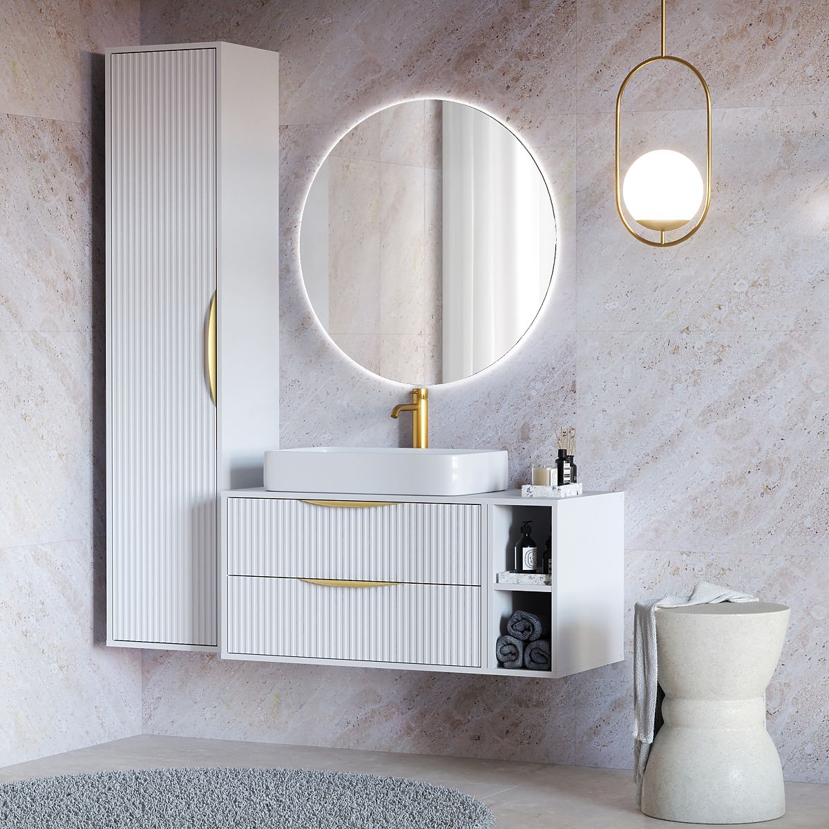 Elegant white cabinet with gold handles and grooved panel for bathroom sinks. .. more