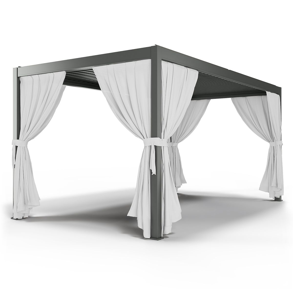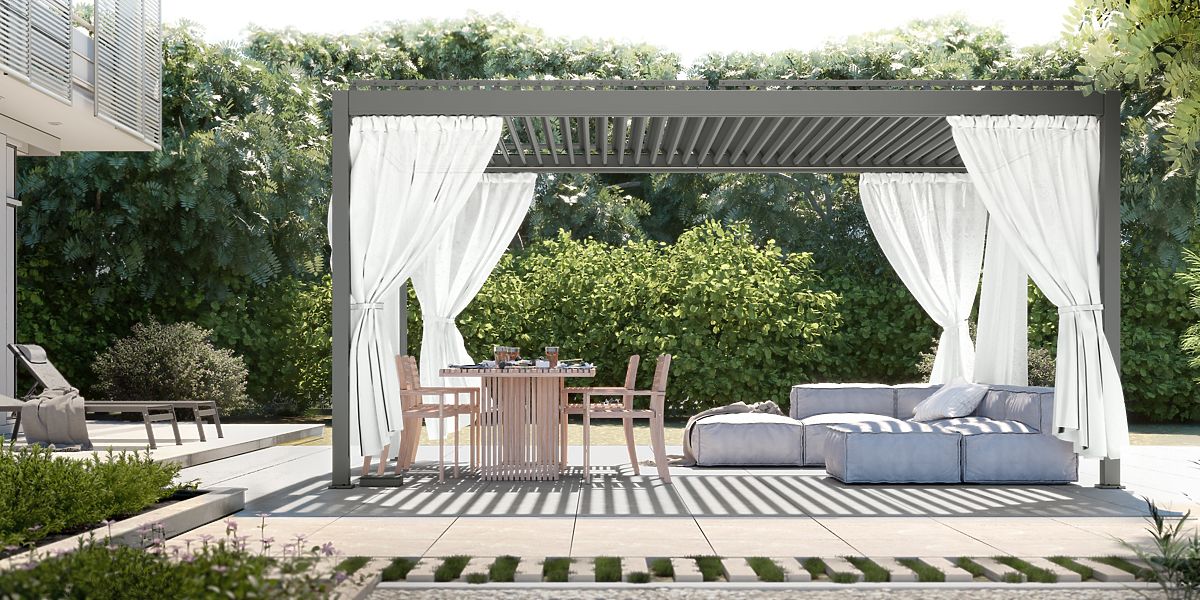 White curtain for pergola, protects from UV rays and provides privacy. .. more