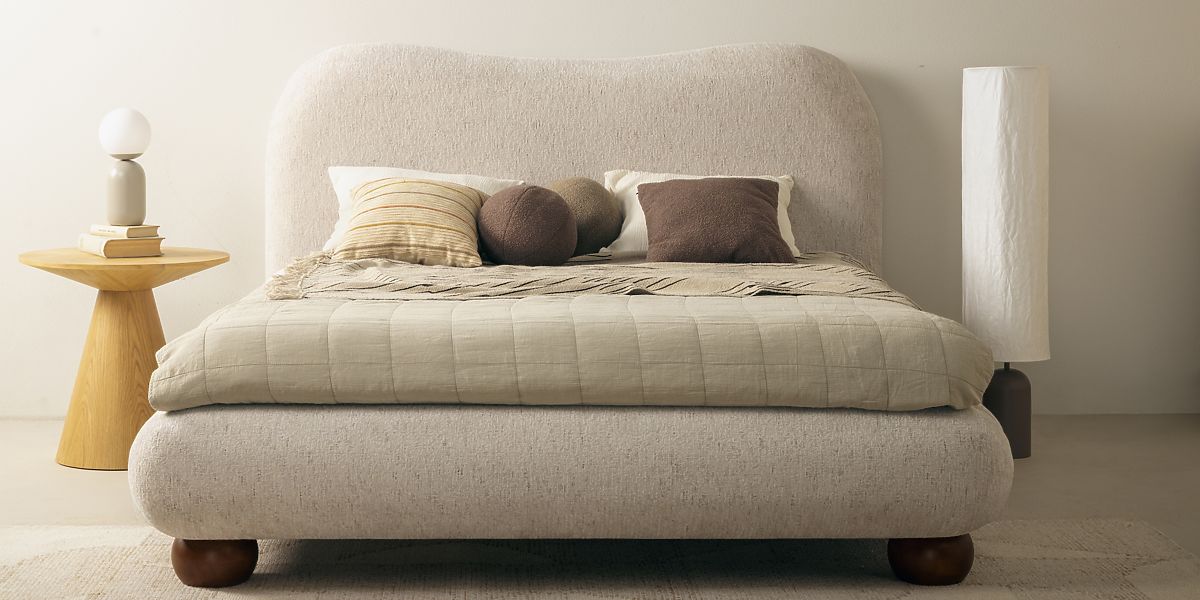 Bowee bed offers elegance and comfort with light beige upholstery and round legs. .. more