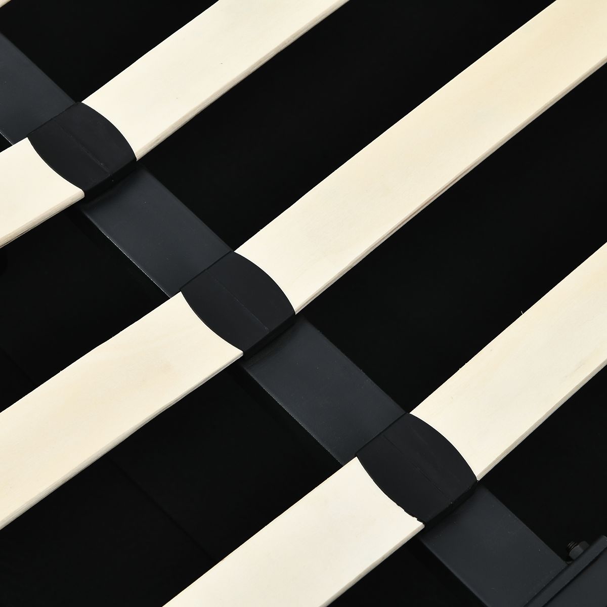 Light beige upholstered bed with storage and slatted frame. .. more