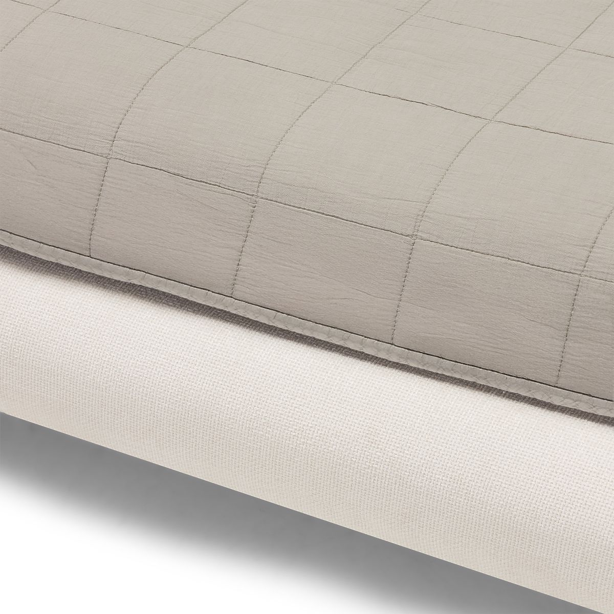 Light beige upholstered bed with unique ball-shaped legs. .. more