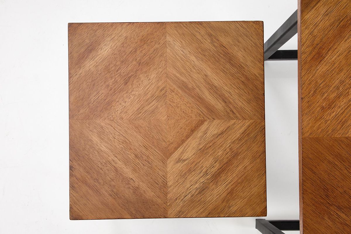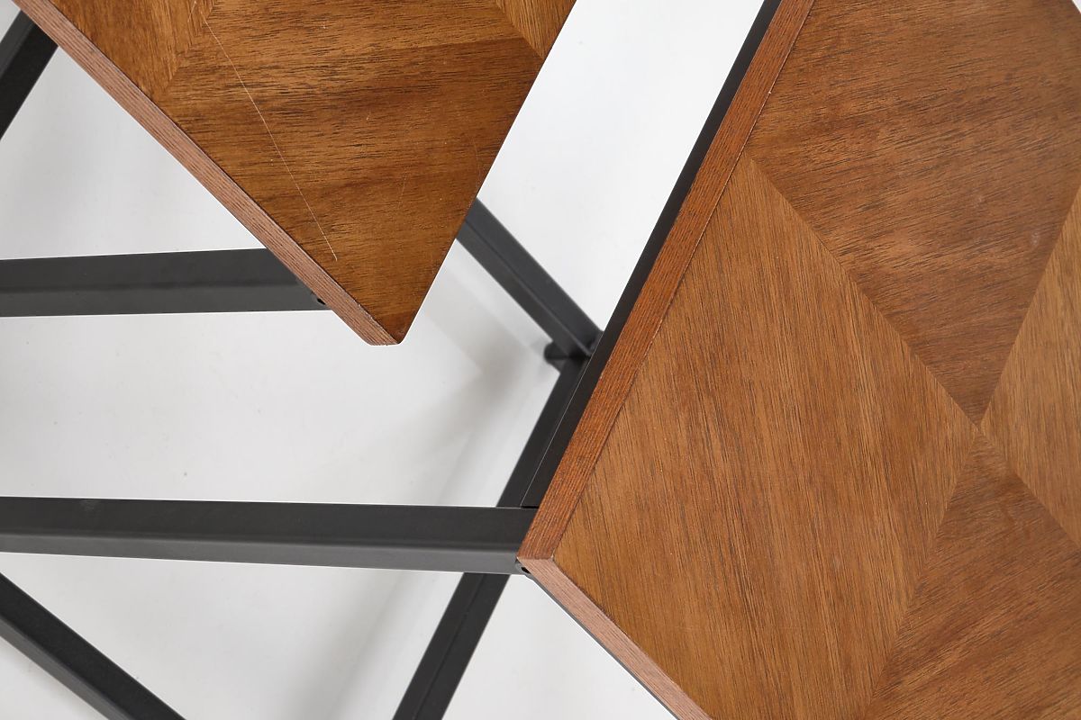 Set of 2 walnut and black benches with MDF and steel construction. .. more