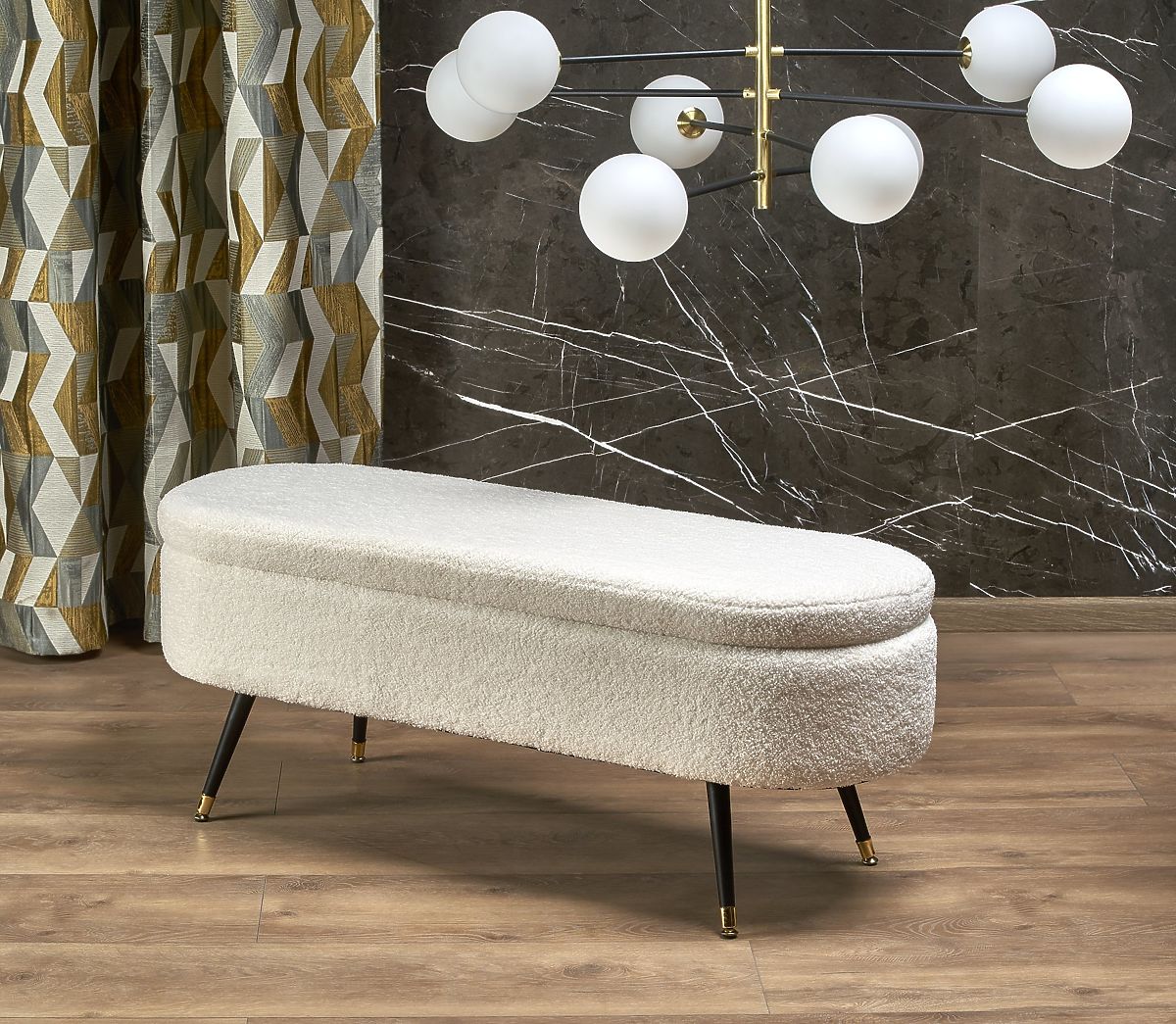 AVEIRO Ottoman represents an ideal way to stylishly expand seating space while gaining valuable storage. With its modern, subtle design in cream color, it adds a touch of elegance and coziness to the interior. Perfectly complements the bedroom by the bed, serves as a great addition to the living room sofa, and finds practical use in the hallway. The seat is covered with bouclé fabric, reminiscent of soft sheep's wool. This soft, warm material makes every sitting experience pleasant and comfortable. The ottoman looks stylish yet cozy—ideal for modern, Scandinavian, or minimalist interiors. An invaluable advantage of the AVEIRO ottoman is the practical storage space found under the lift-up lid attached with pistons. It can hold clothes, accessories, textiles, or other small items you want to keep handy but out of sight.