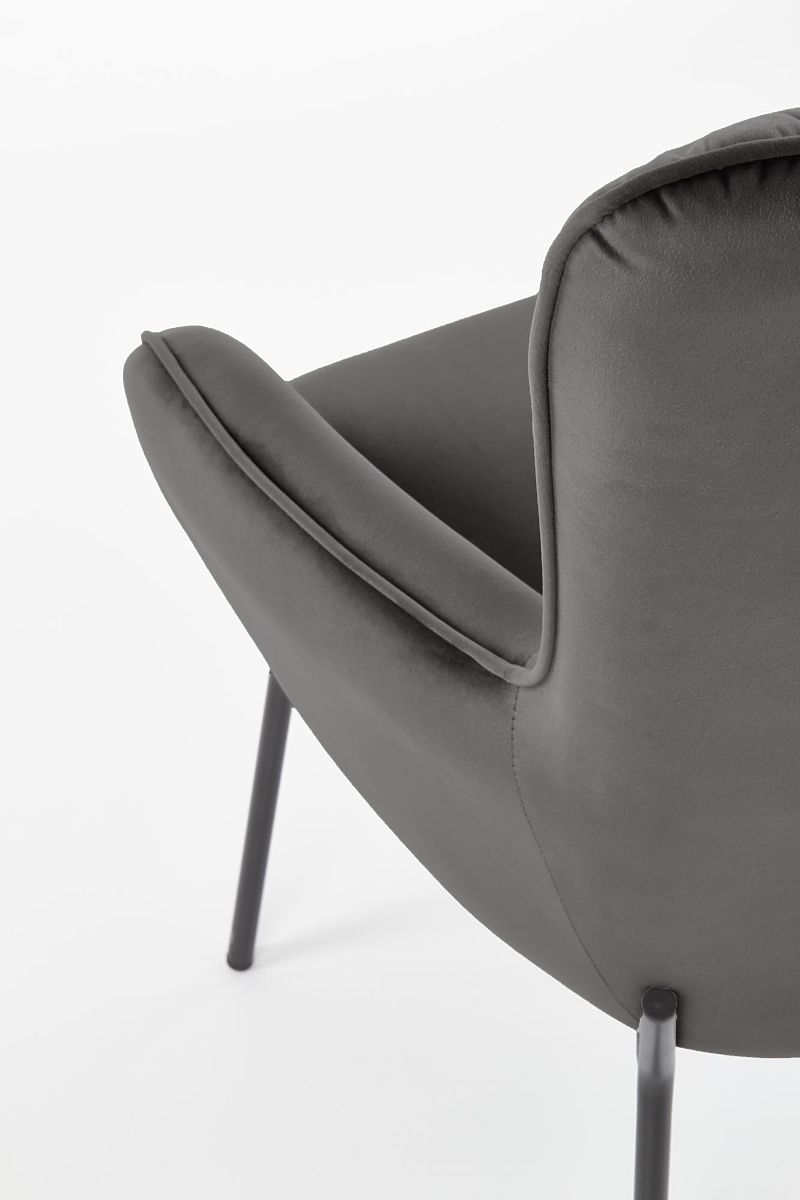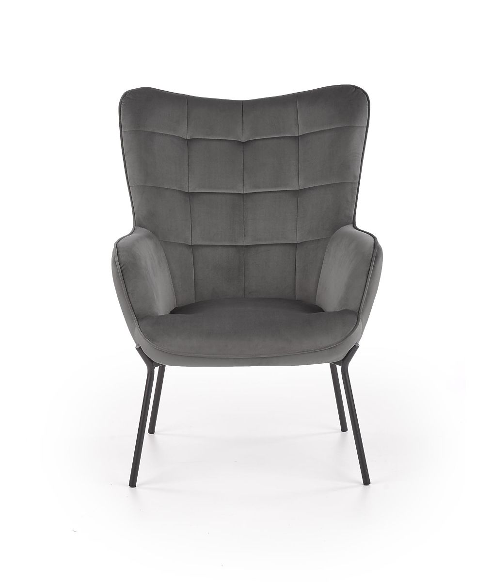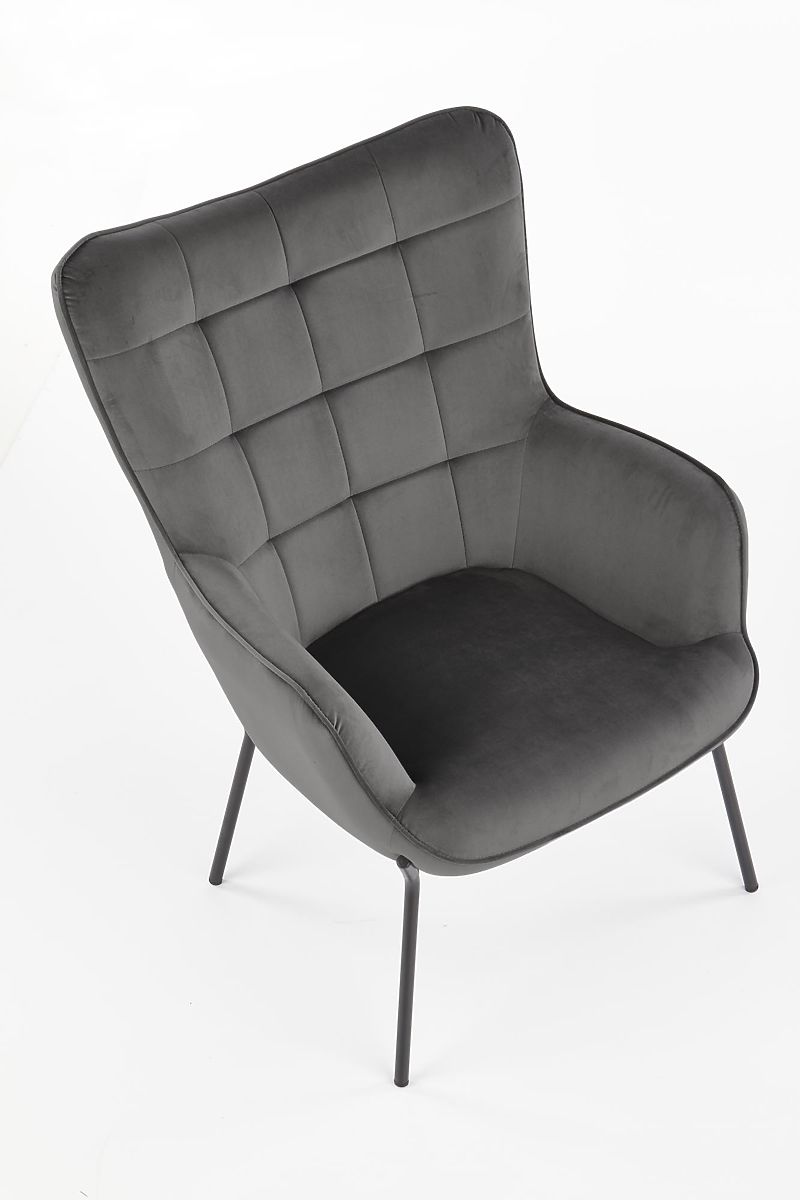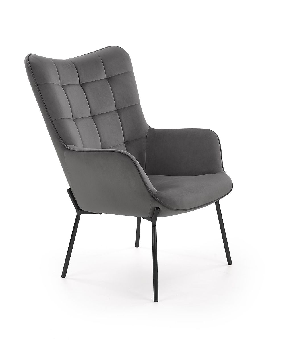Relaxation chair with gray upholstery and black legs. .. more