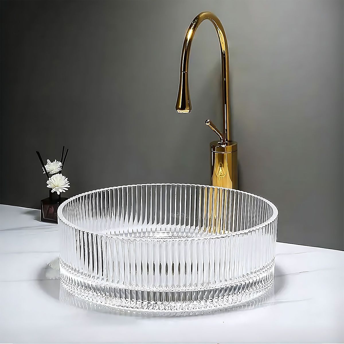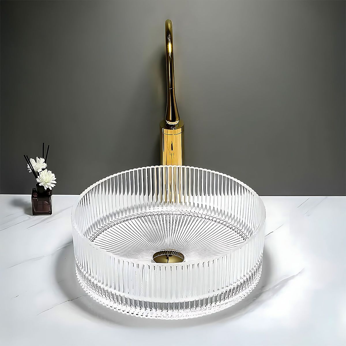 The Ingrid 36 furniture washbasin is the perfect choice for those seeking an elegant and original solution for their bathroom. Made from high-quality glass, it features a grooved surface and transparent design, adding a unique character and luxurious style to the interior.