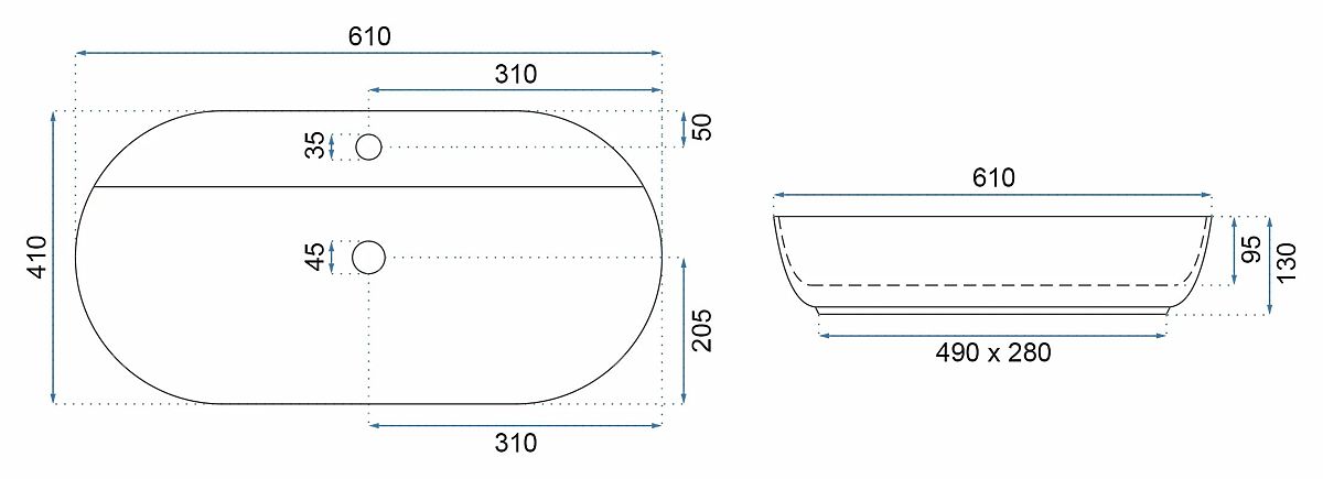 The Rea Aura sink, with its intriguing elliptical shape, perfectly complements any modern interior. It is designed for installation on a countertop or cabinet. The sink is not completely covered, featuring a cutout at the back for the faucet mounting hole.