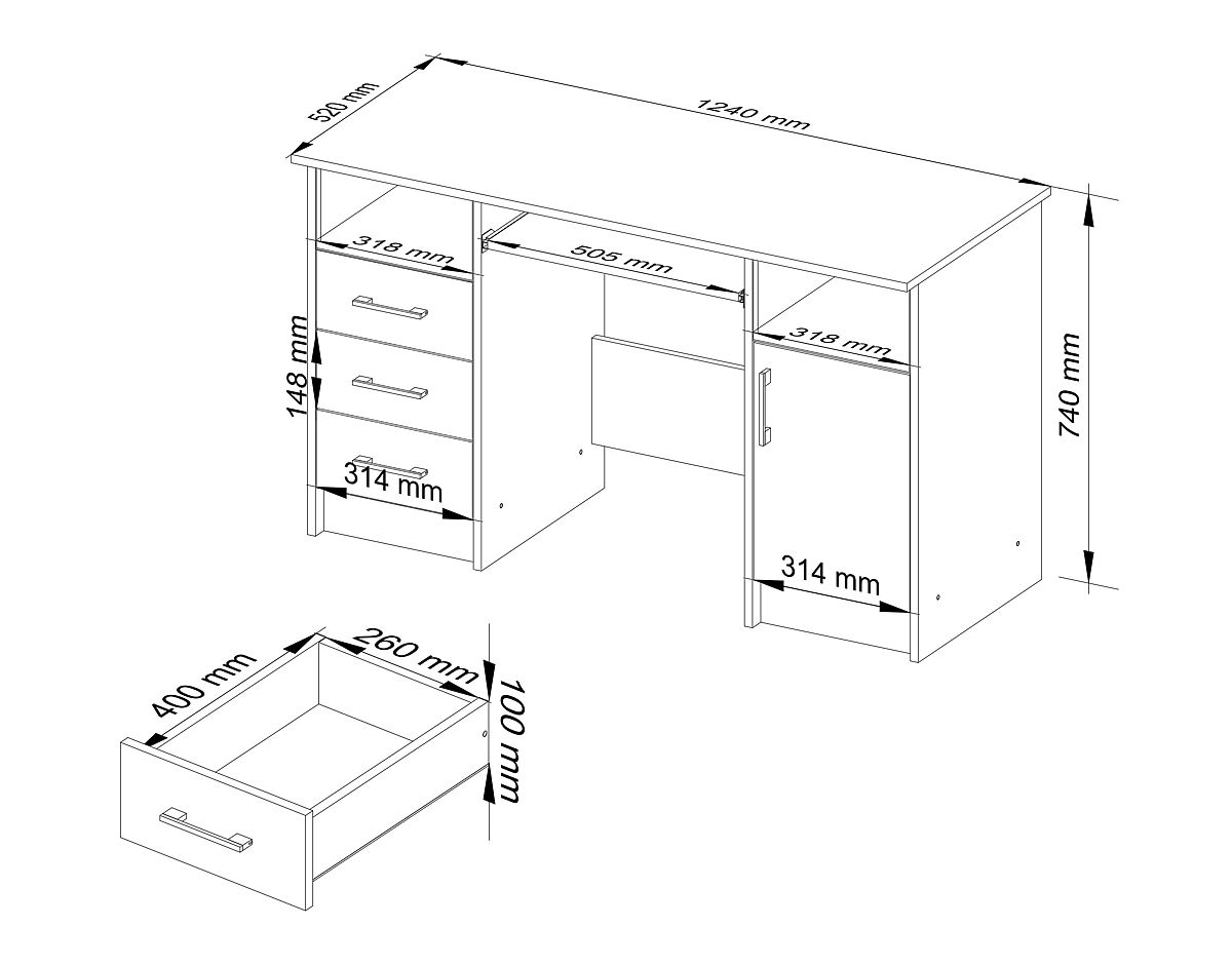 - Drawers and keyboard shelf move on metal ball-bearing slides