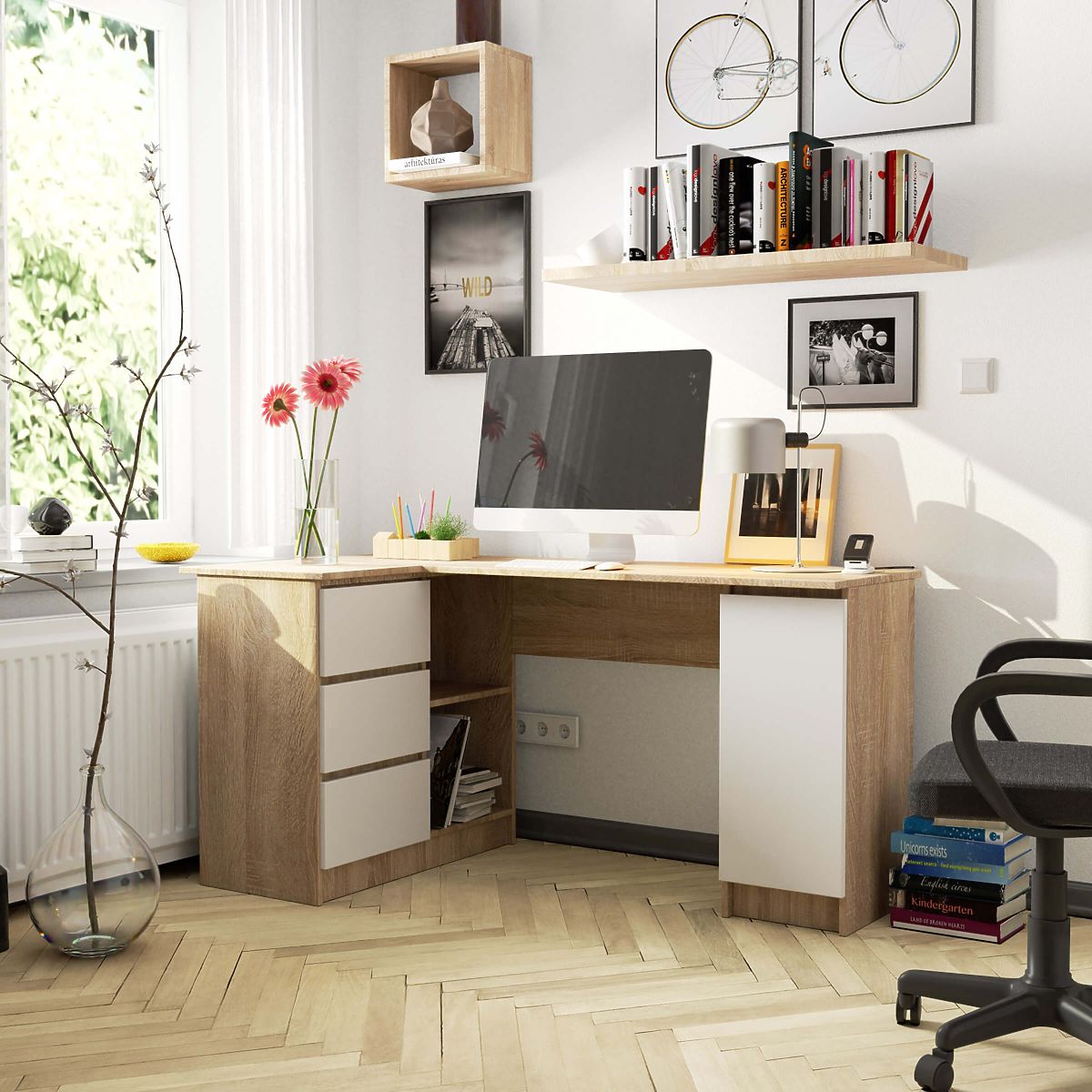 Corner computer desk with drawers and cabinet - B20 - Sonoma oak with white front
