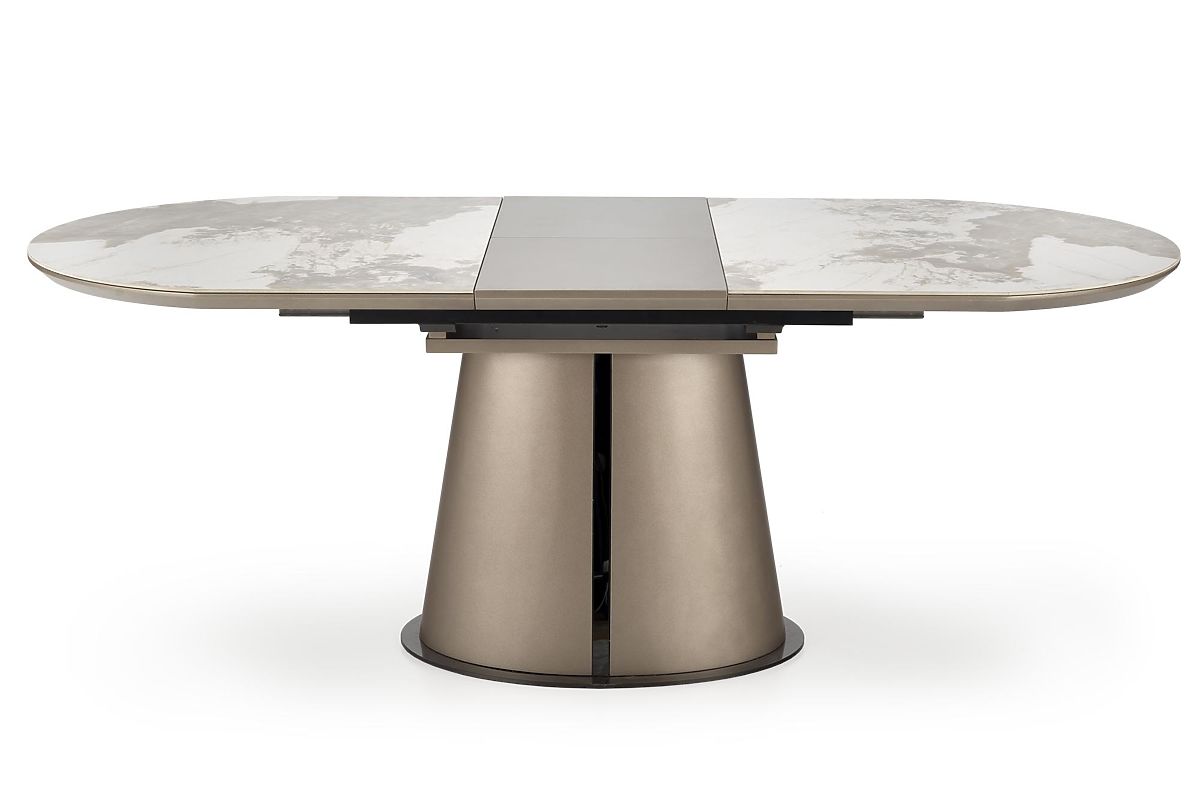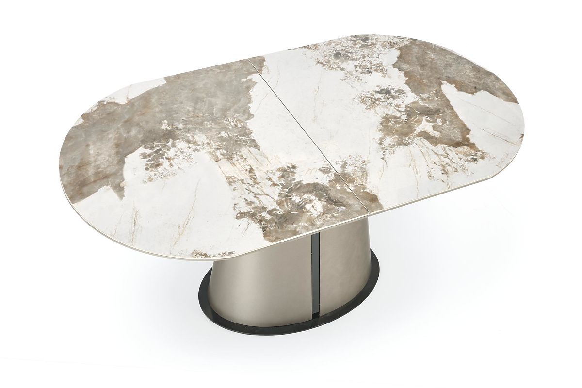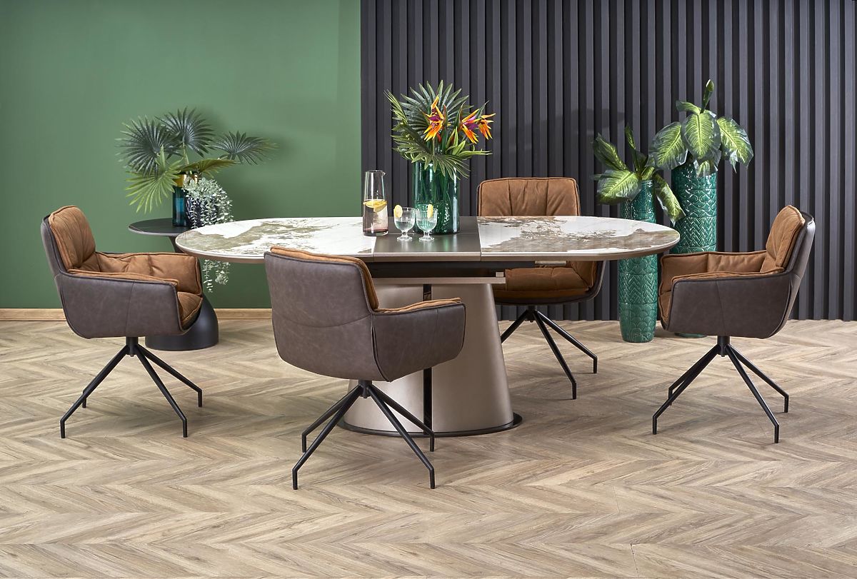The Robinson dining table is a confident design piece that will become an unmistakable centerpiece of any modern dining room. It combines a luxurious appearance, high functionality, and quality materials, meeting the demands of even the most discerning users. The main feature of the table is the ceramic top with an elegant marbled structure, which looks very exclusive and is also exceptionally resistant to scratches, heat, and everyday use. The top is harmoniously complemented by a stable construction made of lacquered MDF boards and powder-coated steel, ensuring strength and long-lasting durability. The Robinson table is not only visually impressive but also practical. Thanks to its extendable function, its length can be quickly extended from 160 cm to 200 cm, allowing comfortable dining for up to 8 people.