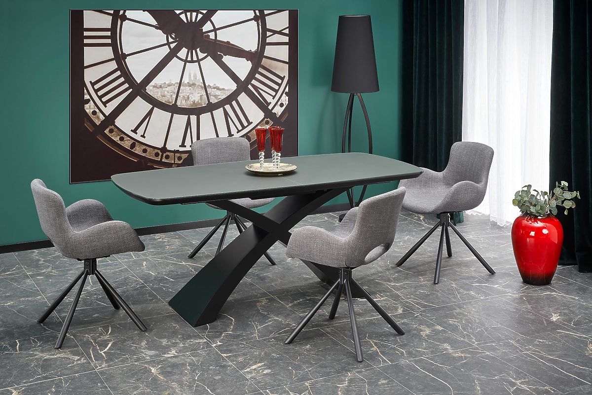 The elegant and spacious Silvestro dining table is the perfect addition to modern and industrial-style interiors. With its extendable feature, it offers ample space for family dinners, celebrations, or gatherings with friends. The table stands out with its original design: black legs made of sturdy lacquered MDF complement the gray glass top, giving the whole piece a unique industrial look and sophisticated style.