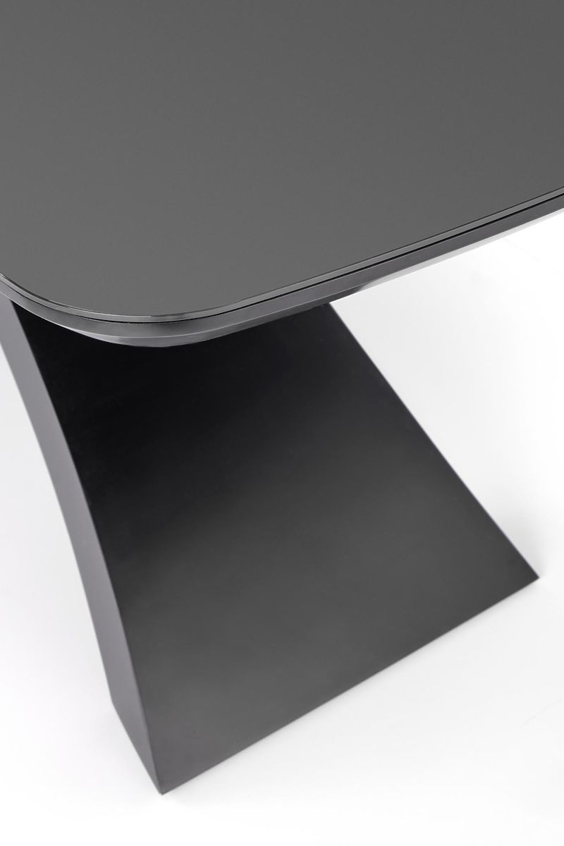 Extendable dining table with gray glass top and black MDF legs. .. more
