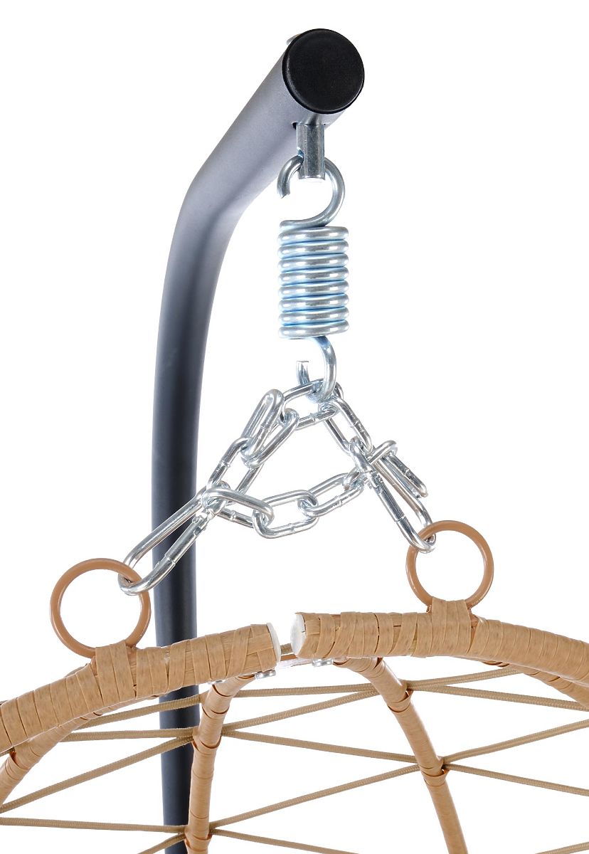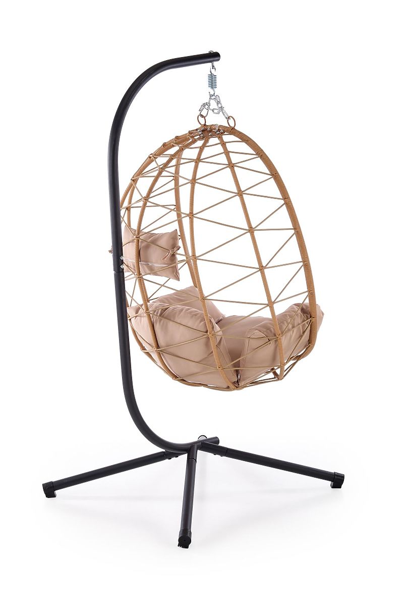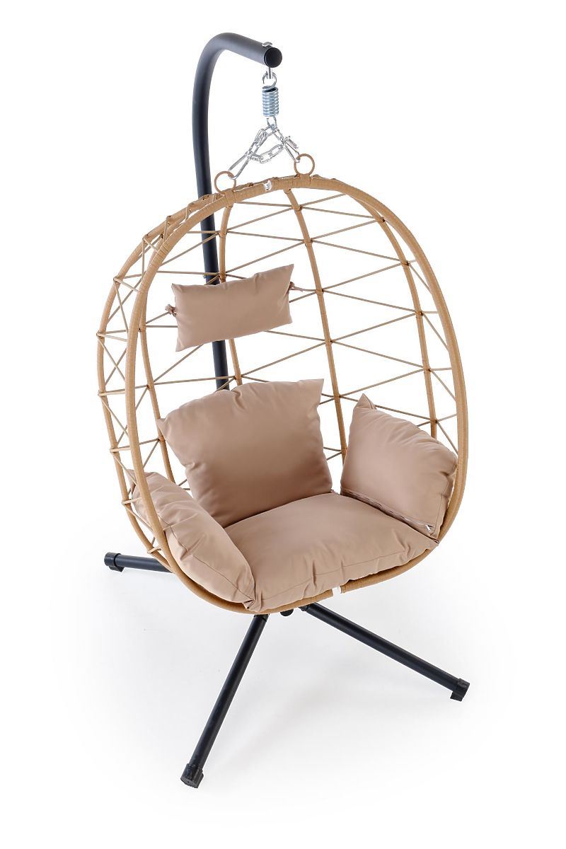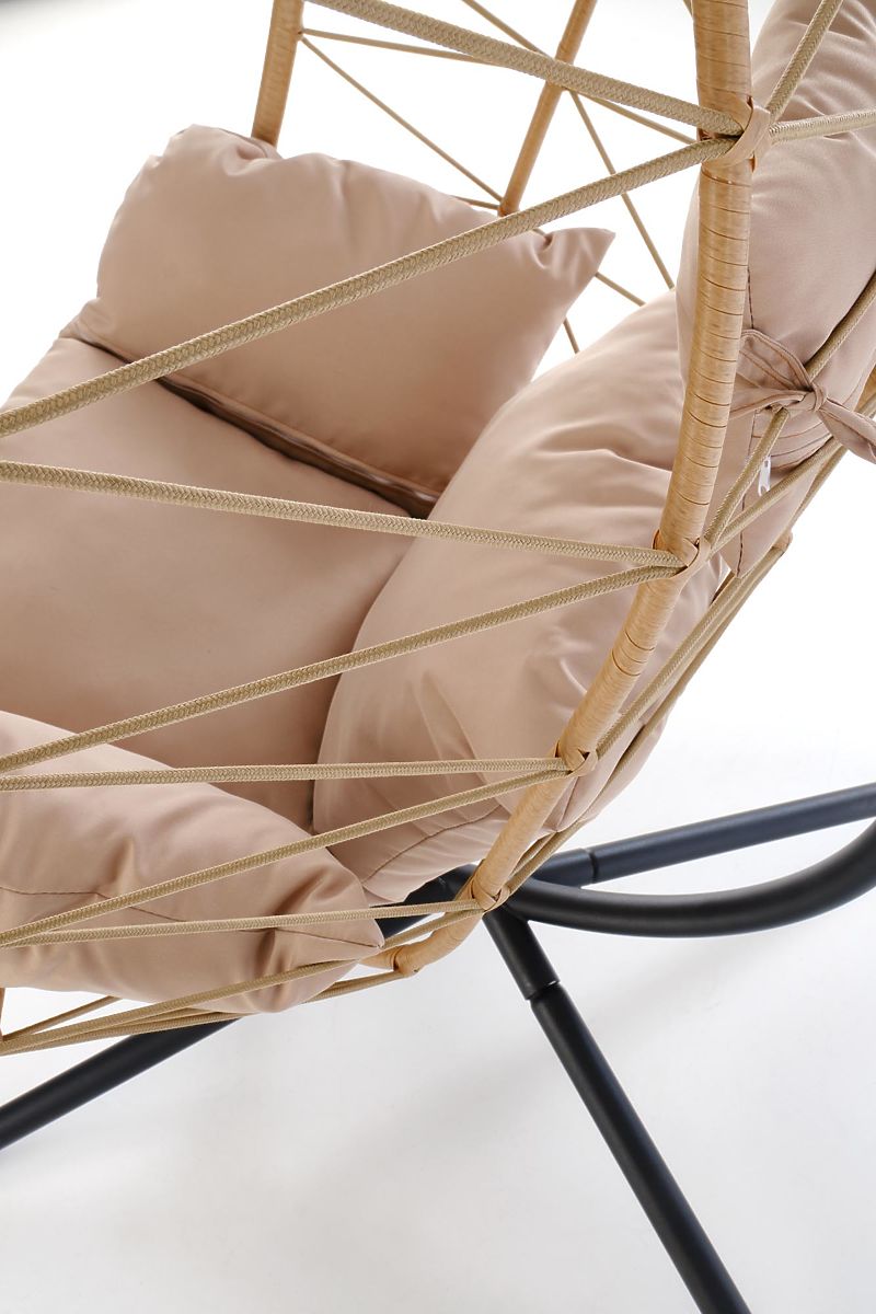 The hanging chair Snake is a stylish relaxation seat designed for one person, creating an ideal spot for rest in the garden, on the terrace, or balcony. Its embracing basket shape provides a sense of privacy and security, while the gentle rocking contributes to overall relaxation and release. The ergonomically shaped basket with a high backrest ensures comfortable seating for reading, conversations, or a short rest. The chair comes with soft cushions that support the seat and back, significantly enhancing comfort during use. Stability is ensured by a freestanding steel frame with a powder coating, eliminating the need to hang the chair from the ceiling. This allows for easy relocation according to the current needs of the relaxation zone. The weight of the frame contributes to safe and stable use. The chair's basket is made from durable eco-rattan, which is airy, sturdy, and suitable for outdoor use. Metal elements ensure the long life and strength of the entire structure, while the textile cushions add a cozy character to the chair.