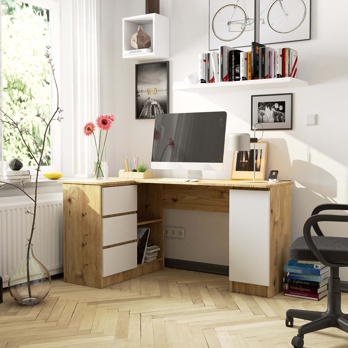 The Corner Desk B20 155 cm LEFT in Oak Artisan color with white front surfaces is elegant office furniture with a modern design. It will be a great choice for home offices and children's rooms. The corner desk integrates into the room arrangement and creates a suitable space for work and study. With drawers, shelves, and a cabinet located on both sides of the desk, necessary items will be within reach. It is also easy to organize documents, books, or office supplies, which can be stored in spacious drawers moving on roller guides. The desk is made of 16 mm thick laminated board by Kronospan, which is resistant to abrasion, ensuring the desk's long lifespan. The furniture edges are covered with ABS edging, providing resistance to mechanical damage.