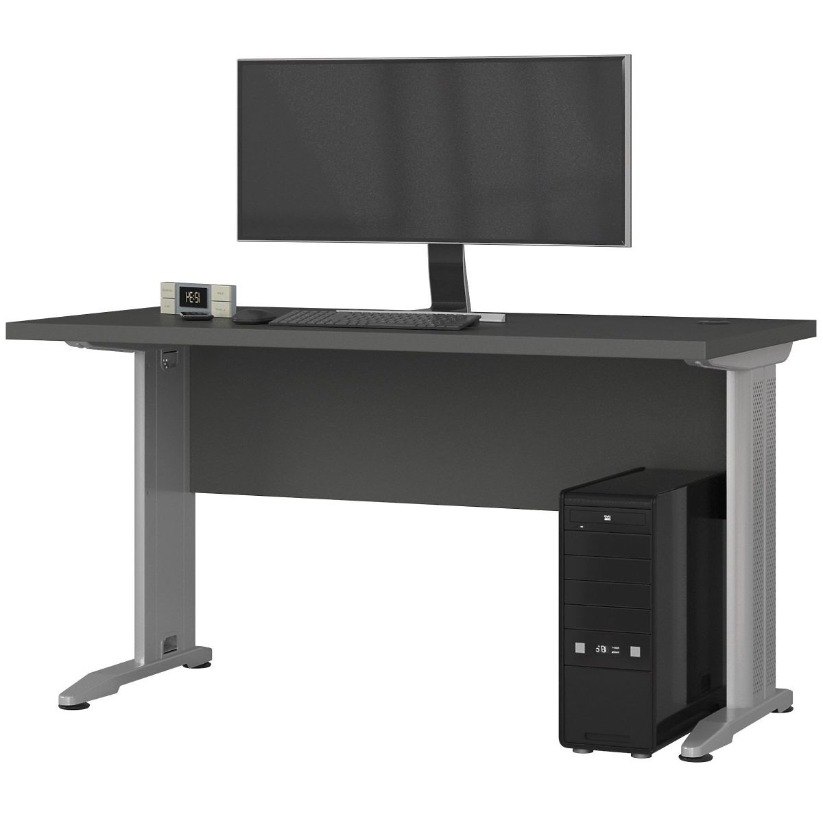 Freestanding desk with graphite gray matte finish and metal legs. .. more