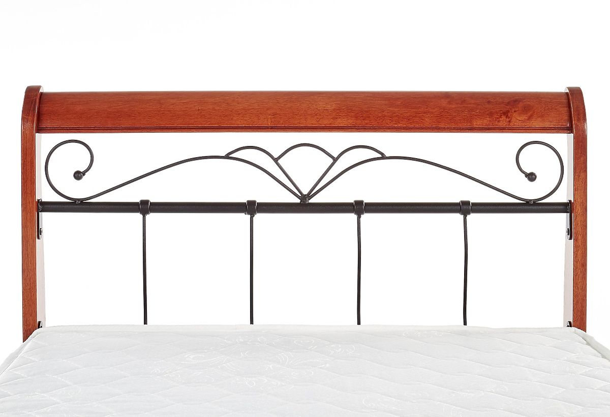 Elegant bed with decorative wire headboard and antique cherry finish. .. more