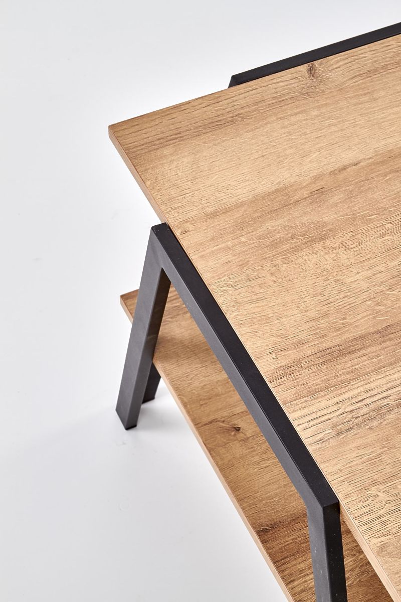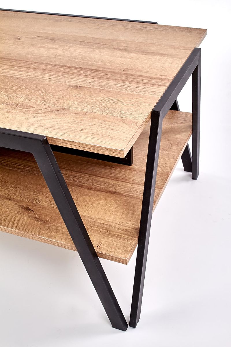Modern coffee table with black steel legs and golden oak shelves. .. more